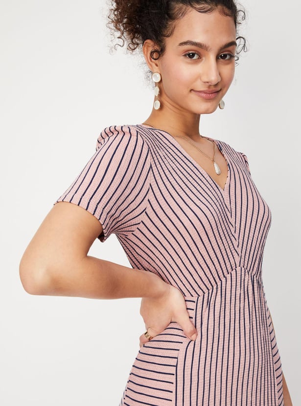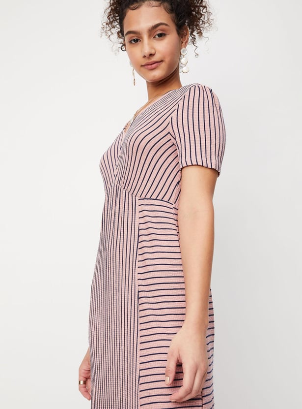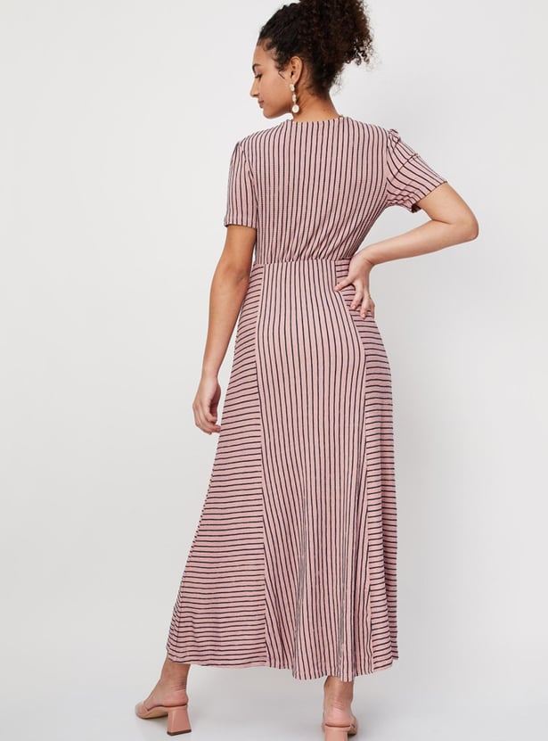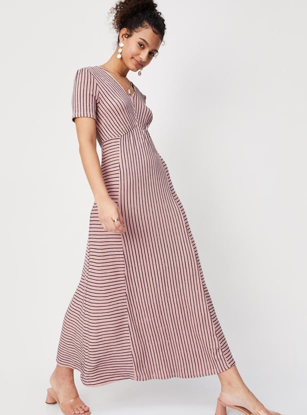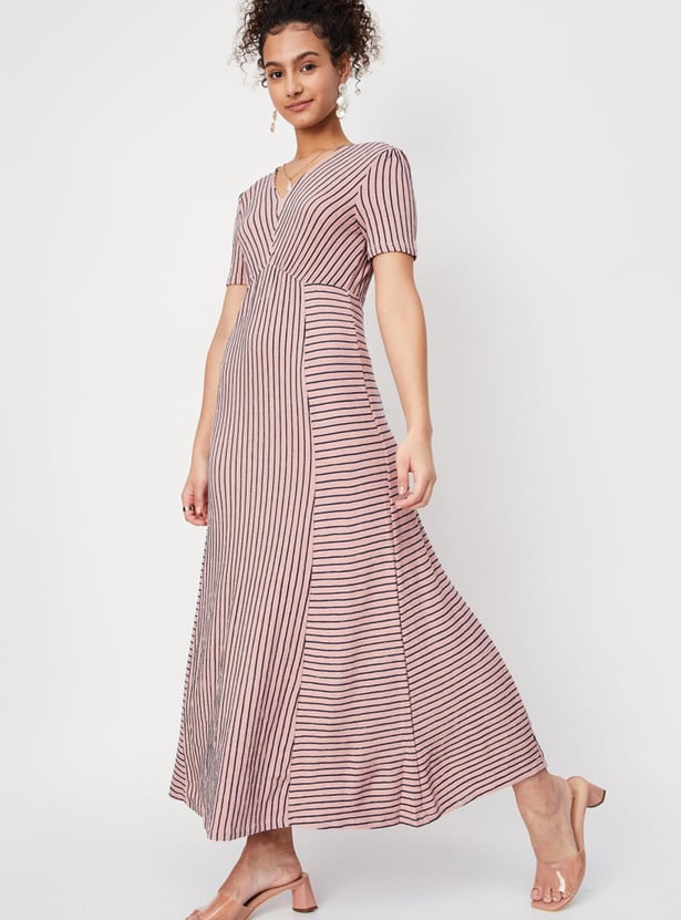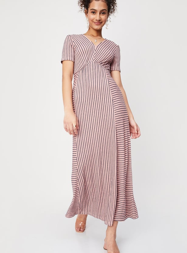 Women Striped Half Sleeves V Neck Maxi Dress