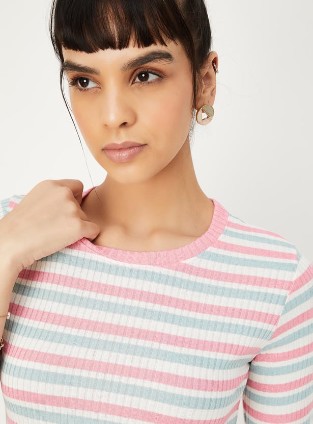 A perfect addition to your casual wardrobe, this T-shirt is updated with a striped pattern. It is designed with a ribbed round neckline and half sleeves.