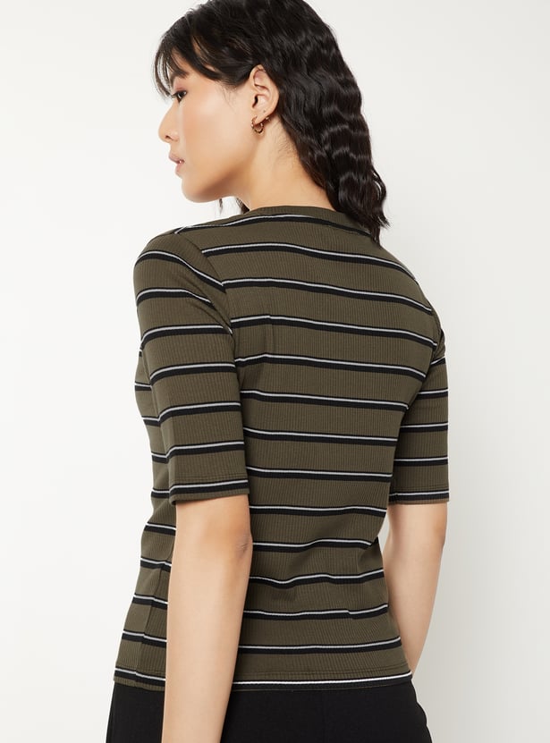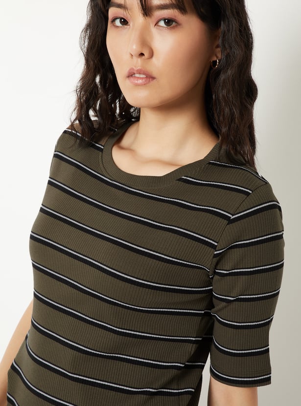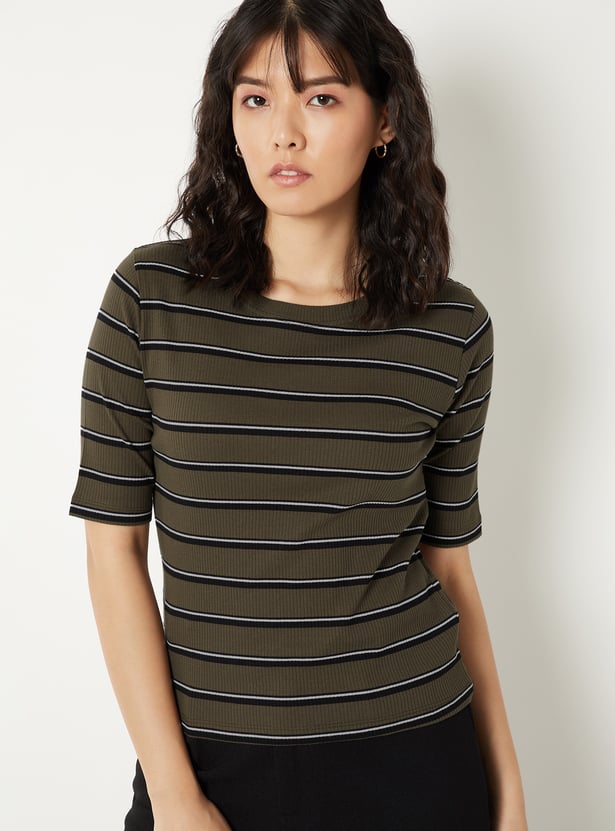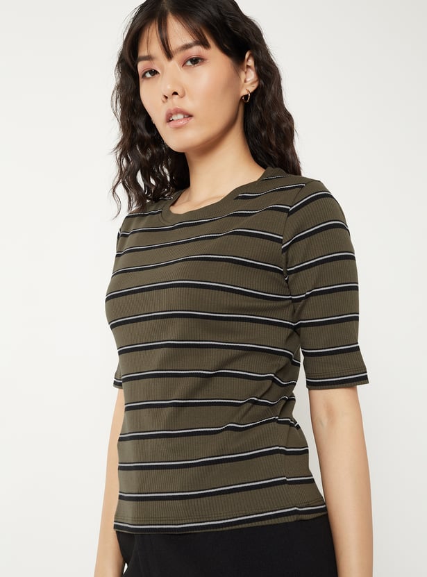 This striped knit T-shirt features a classic round neck and half sleeves with timeless stripe detailing for a casual, chic look. Its comfortable fit makes it perfect for everyday wear. Model Size :