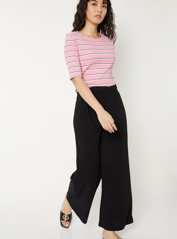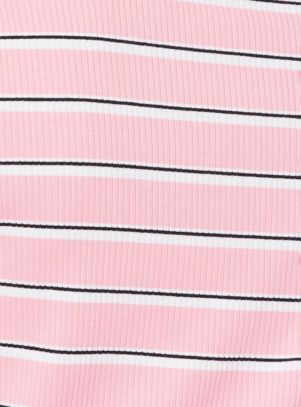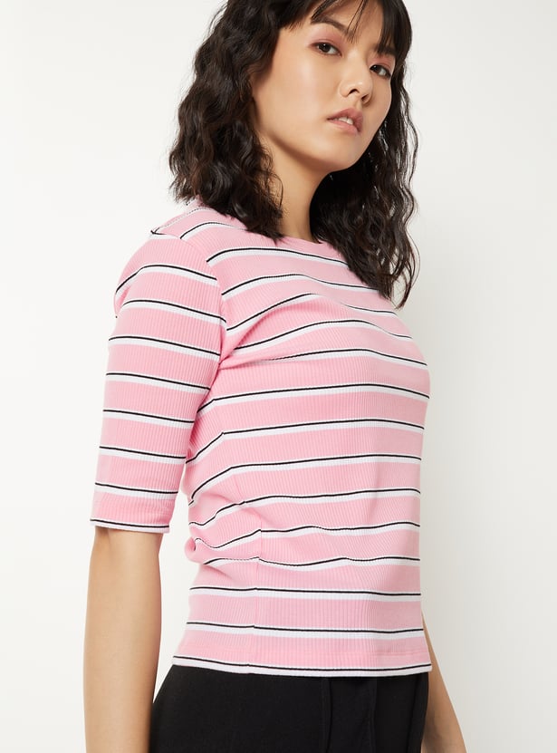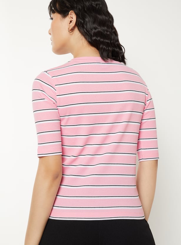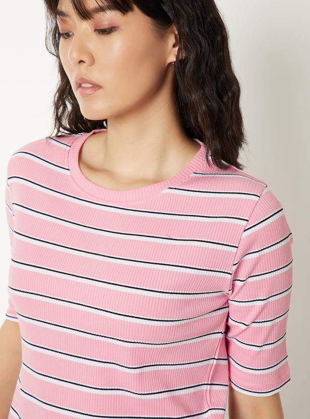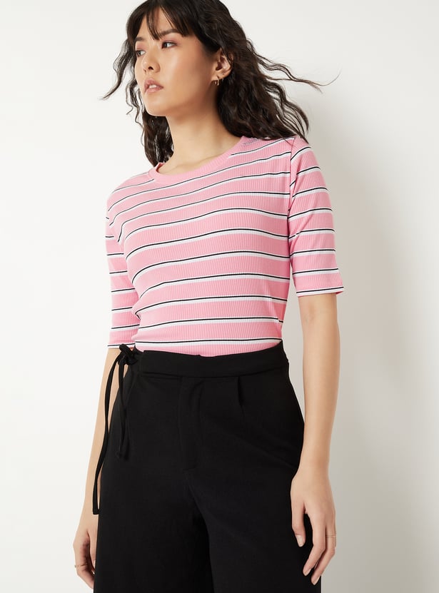 This striped knit T-shirt features a classic round neck and half sleeves with timeless stripe detailing for a casual, chic look. Its comfortable fit makes it perfect for everyday wear. Model Size :
