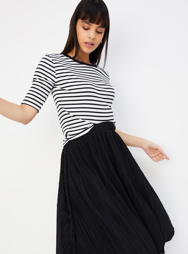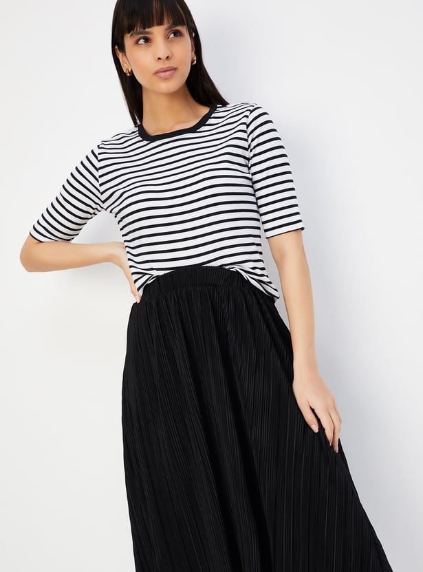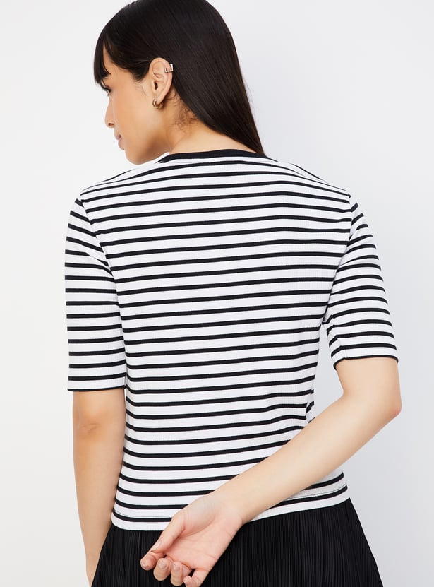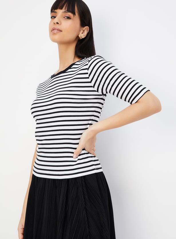 A perfect addition to your casual wardrobe, this T-shirt is updated with a striped pattern. It is designed with a round neckline and half sleeves.