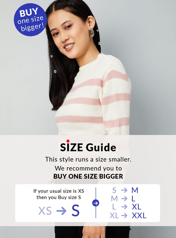 Stay cozy and stylish in this striped sweater, featuring a crew neck, full sleeves, and a ribbed hem for a snug fit. The classic stripe pattern adds a touch of timeless charm to your wardrobe. Model Size :