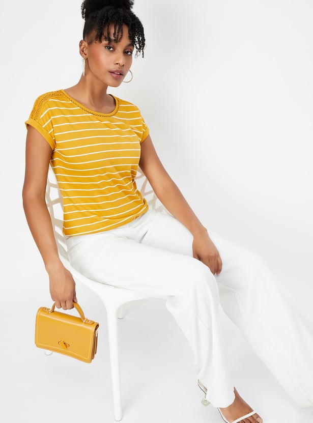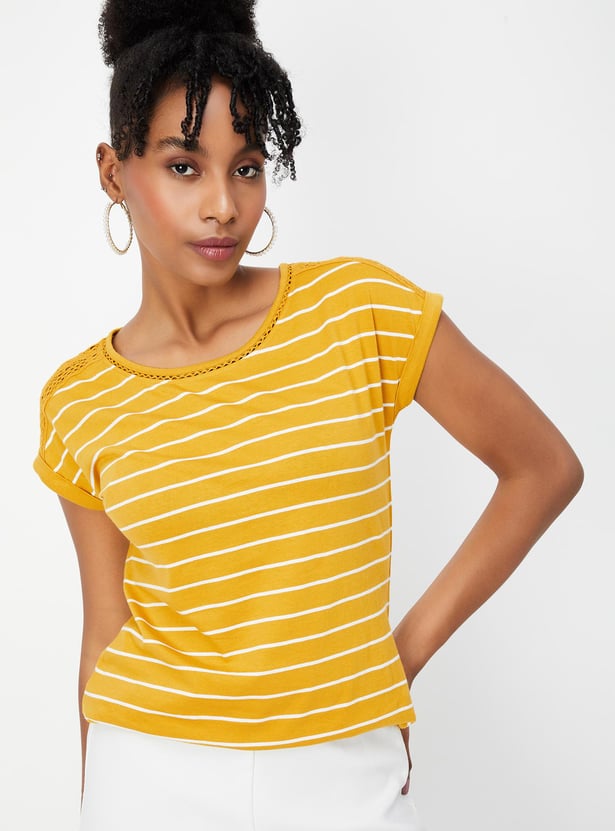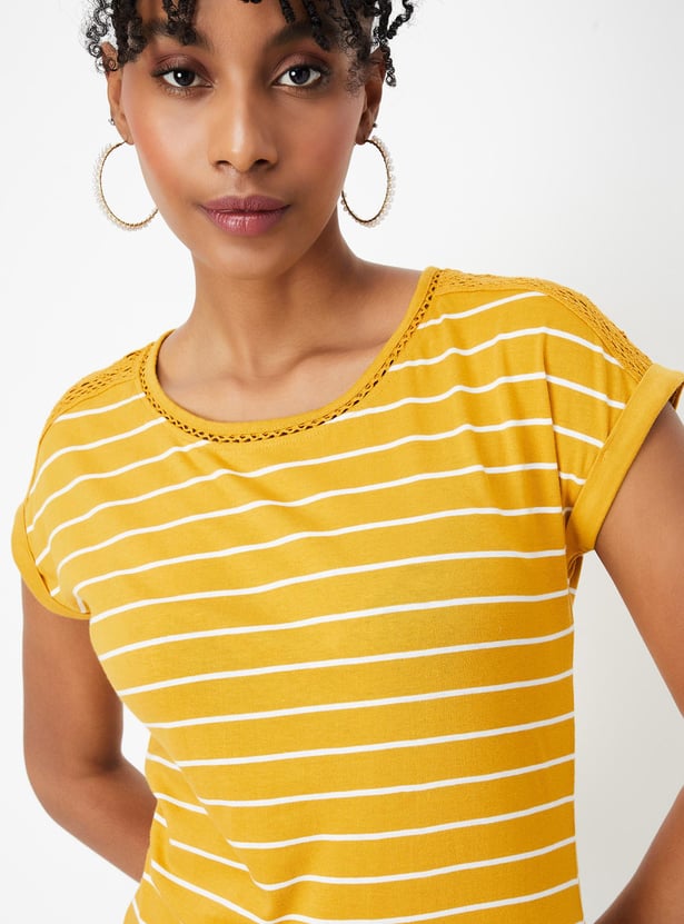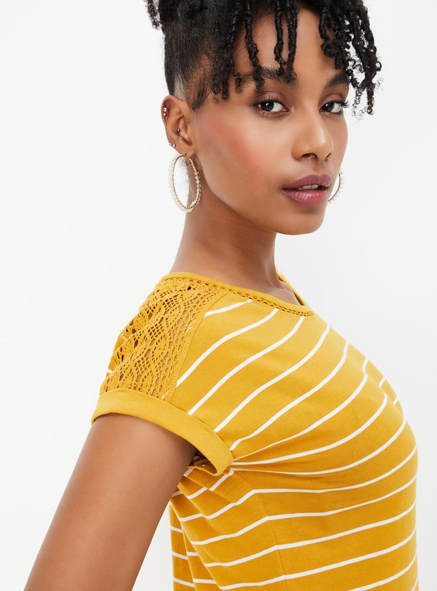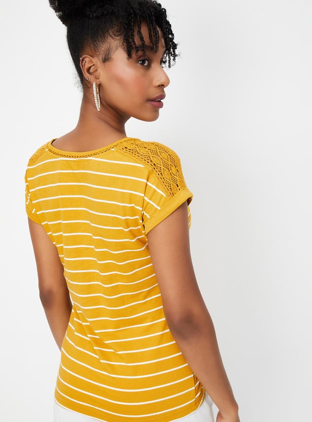Refresh your wardrobe with this striped t-shirt. It boasts stylish half sleeves adorned with lace on the shoulders and a classic round neck for a chic update.