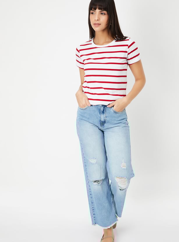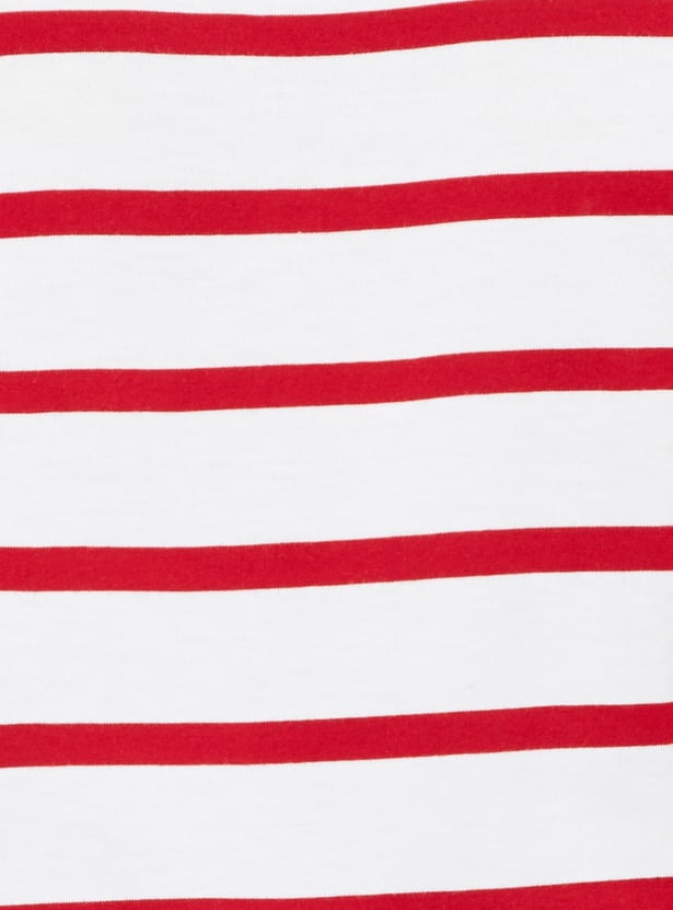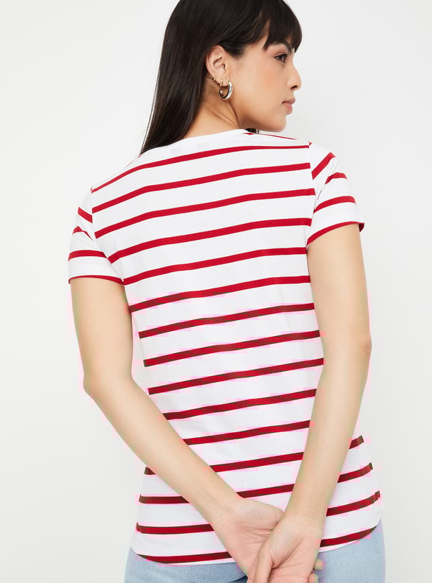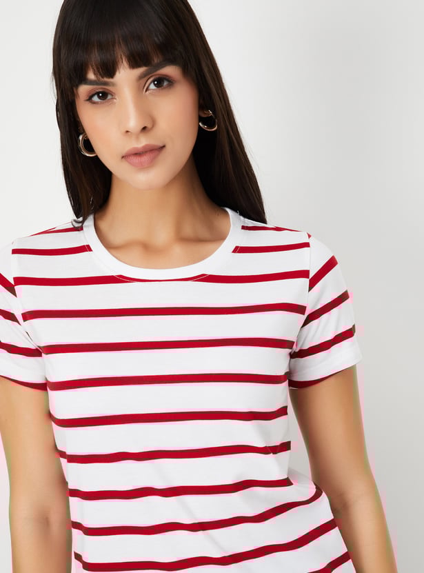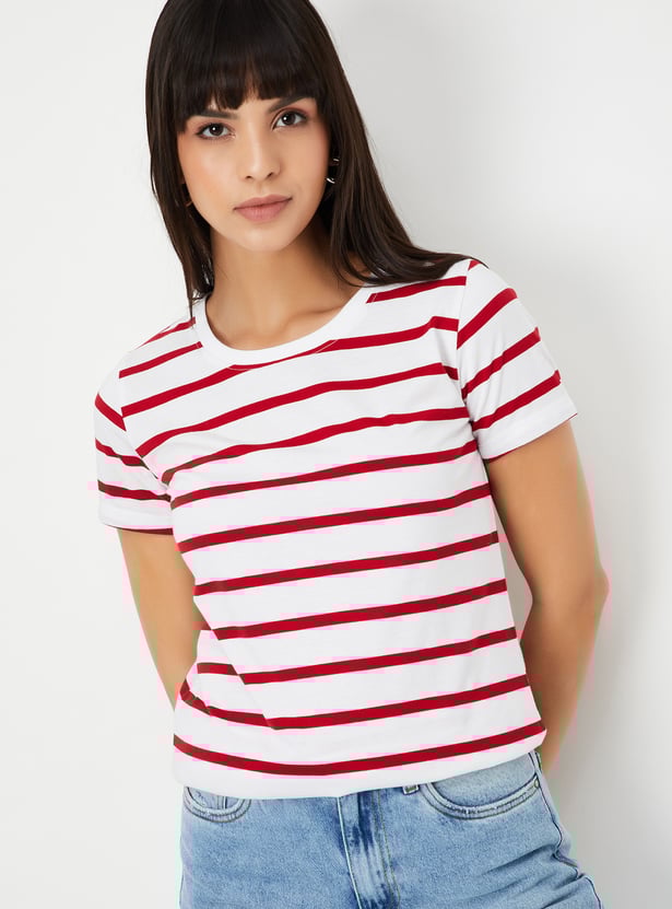 Elevate your casual style with this striped T-shirt. Featuring a round neck, half sleeves, and a straight hem, it offers a timeless and comfortable fit. Model Size :