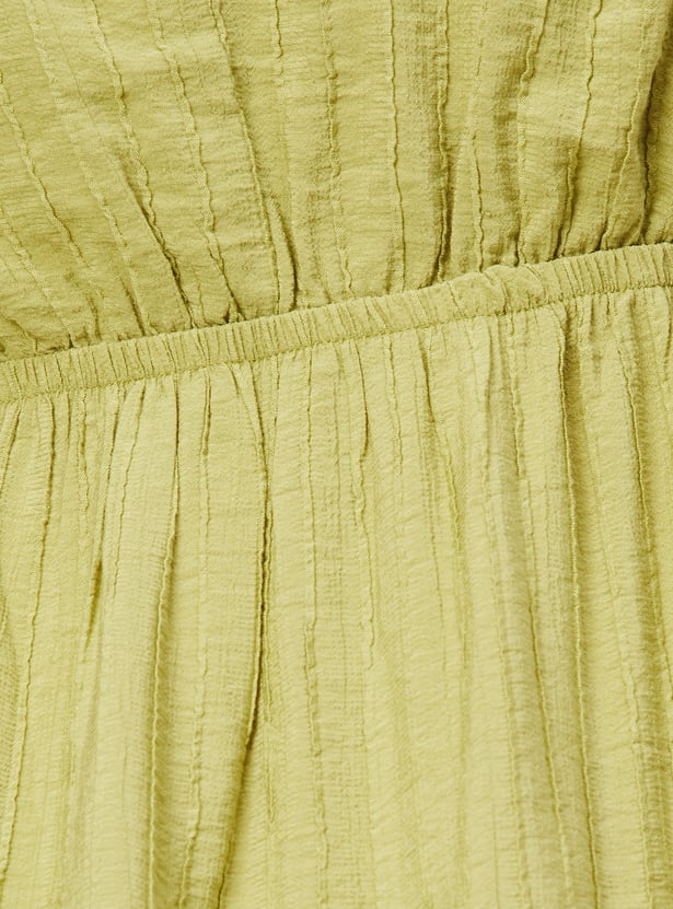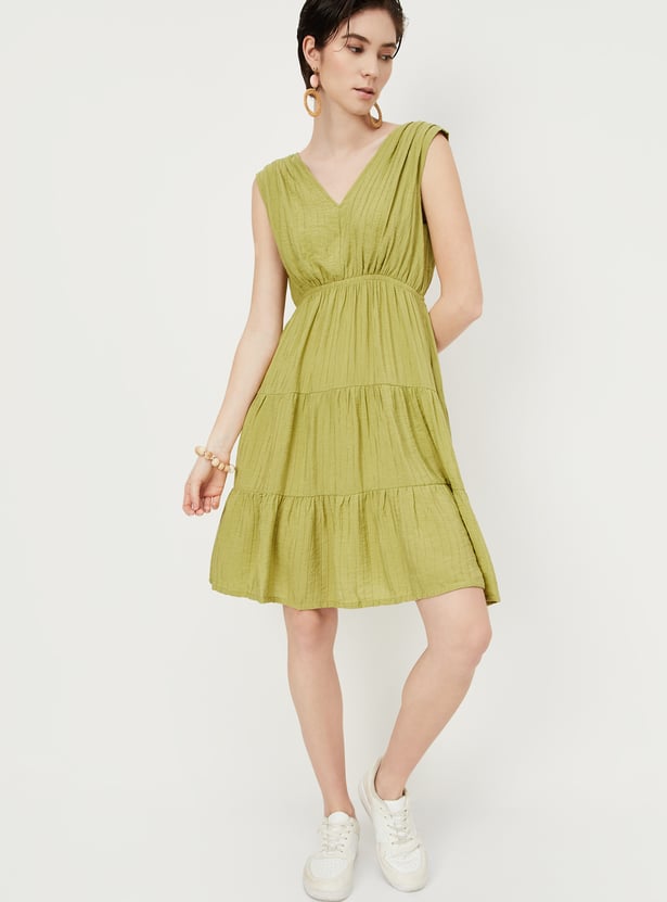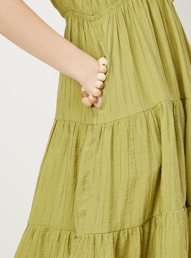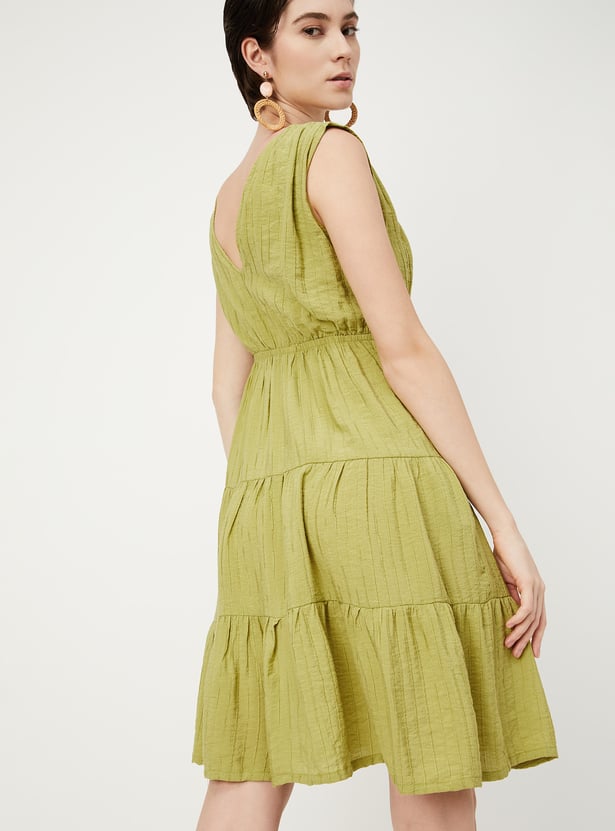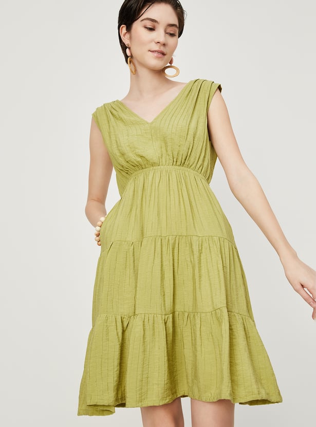Look effortlessly stylish in this versatile striped dress, a timeless addition to your wardrobe. Featuring a V-neck, pleated shoulder design, tiered profile, and convenient side pockets, it seamlessly blends fashion with functionality.