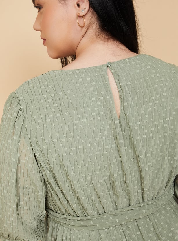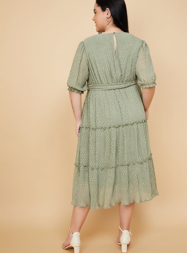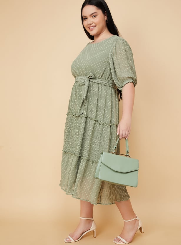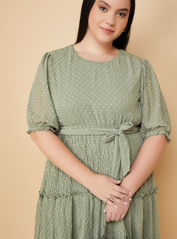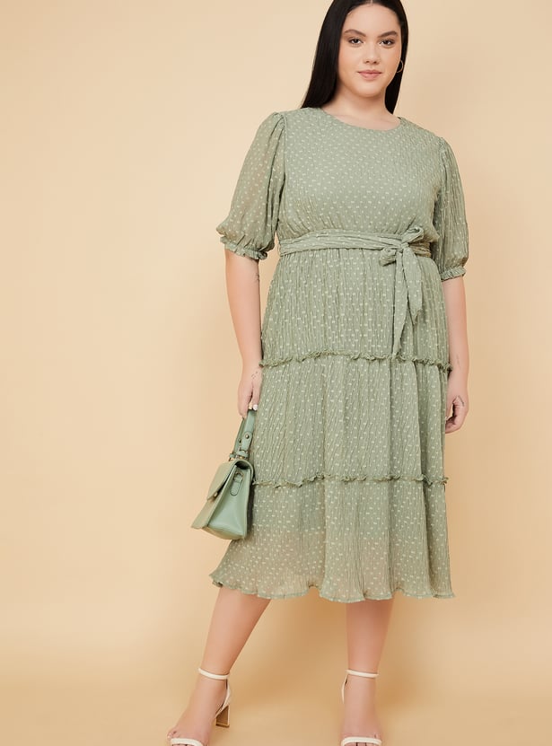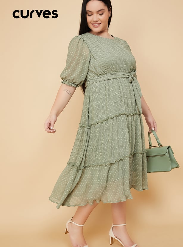 Turn heads with effortless grace in this beautifully crafted swiss dot tiered dress. Featuring a round neck, puff sleeves, and a flattering belted waist, its midi length and flowing tiers add just the right touch of elegance to your look. Model Size :
