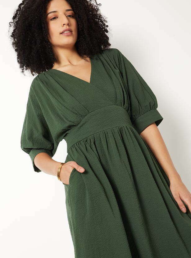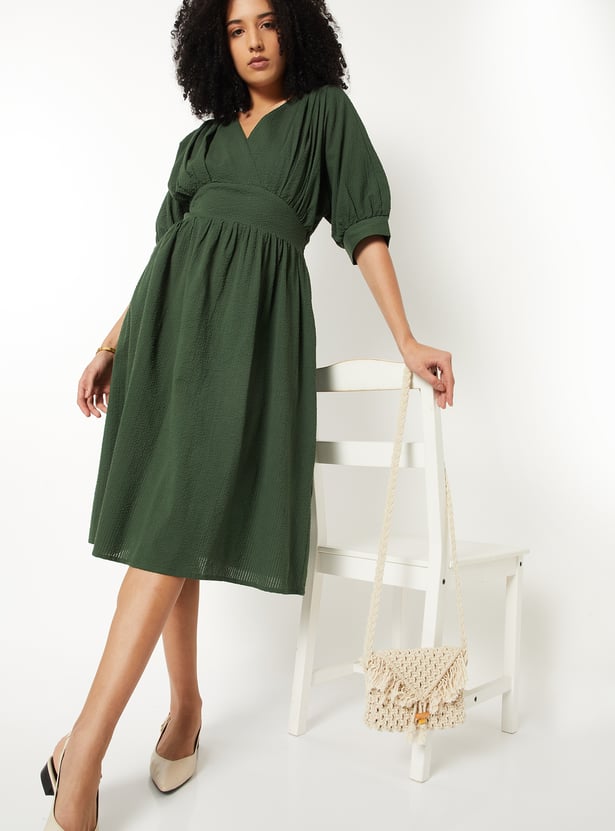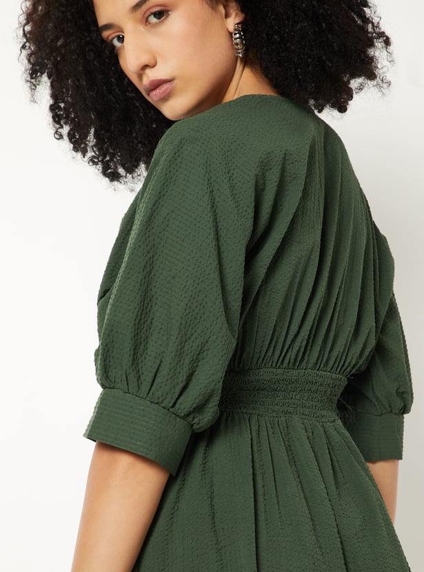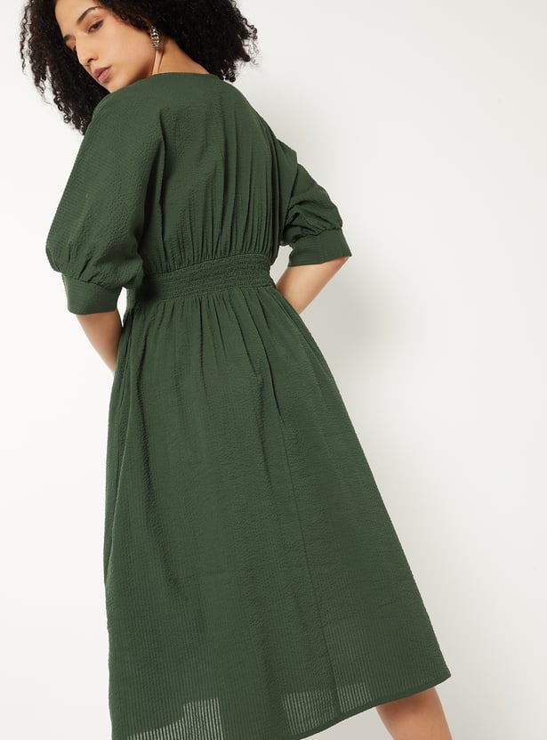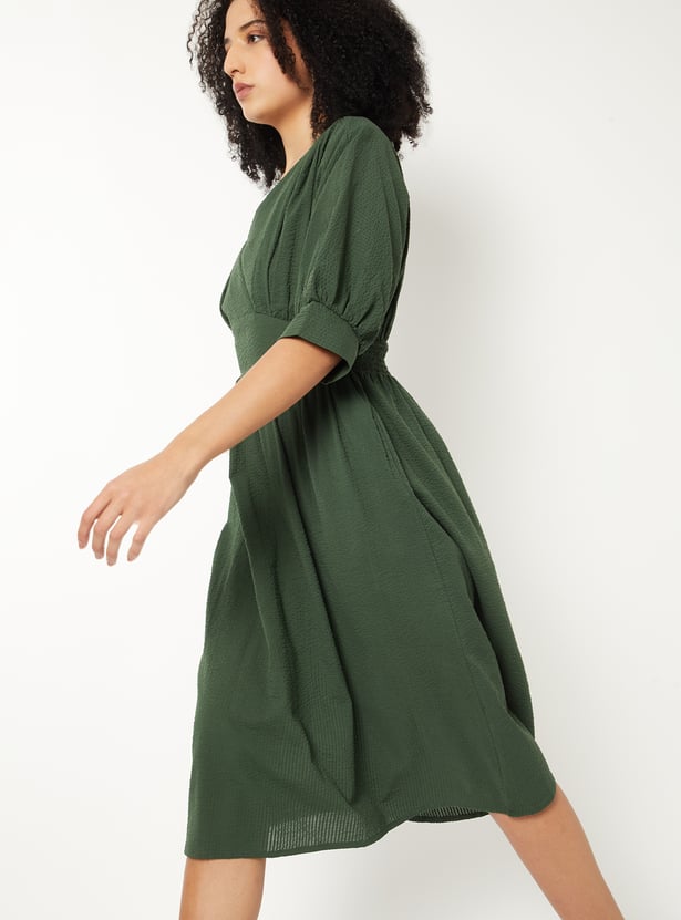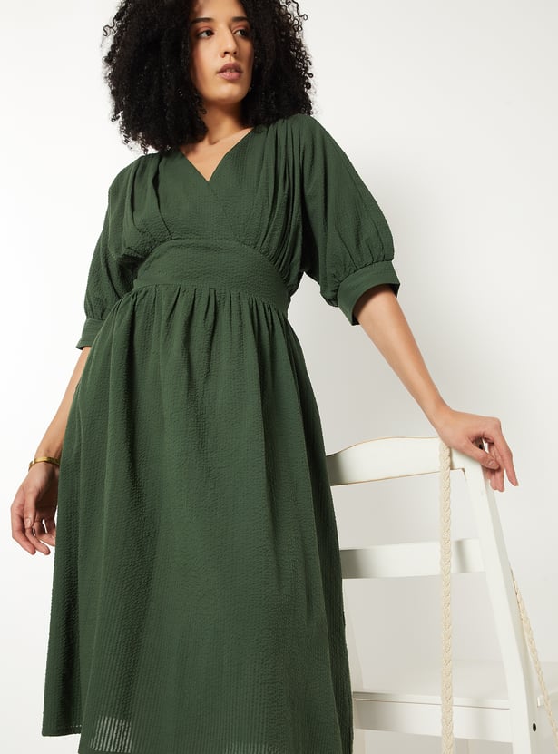 Bring a touch of elegance to your wardrobe with this textured A-line dress. Designed with a flattering V-neckline, knee-length, and puff half sleeves, it features delicate gathers across the surface for added charm.