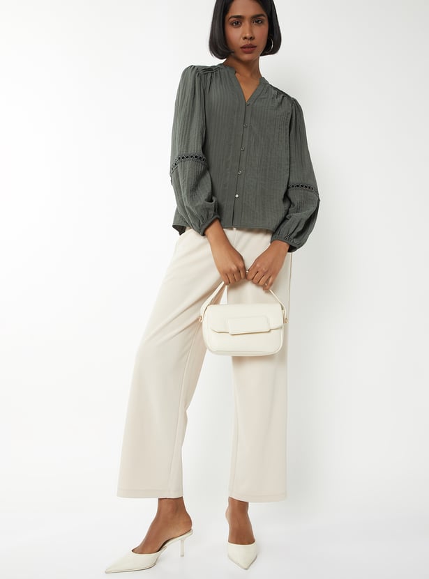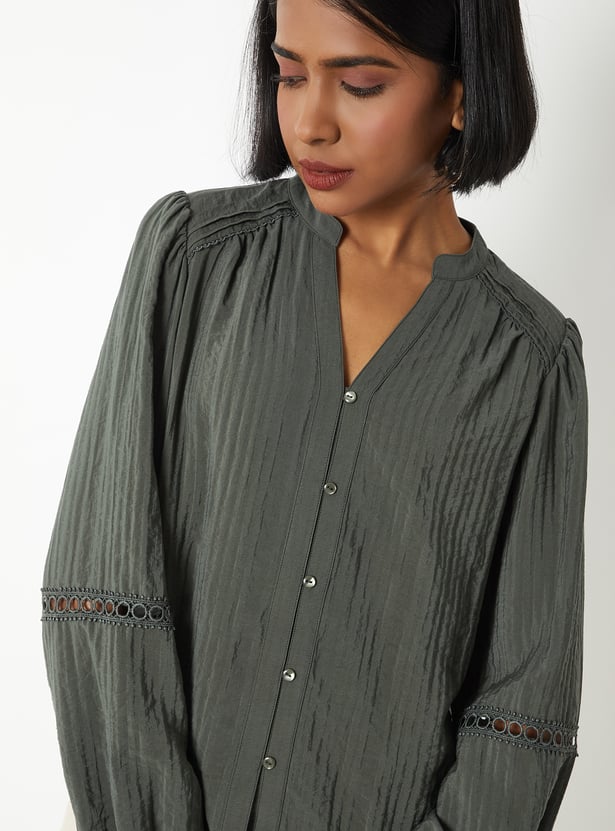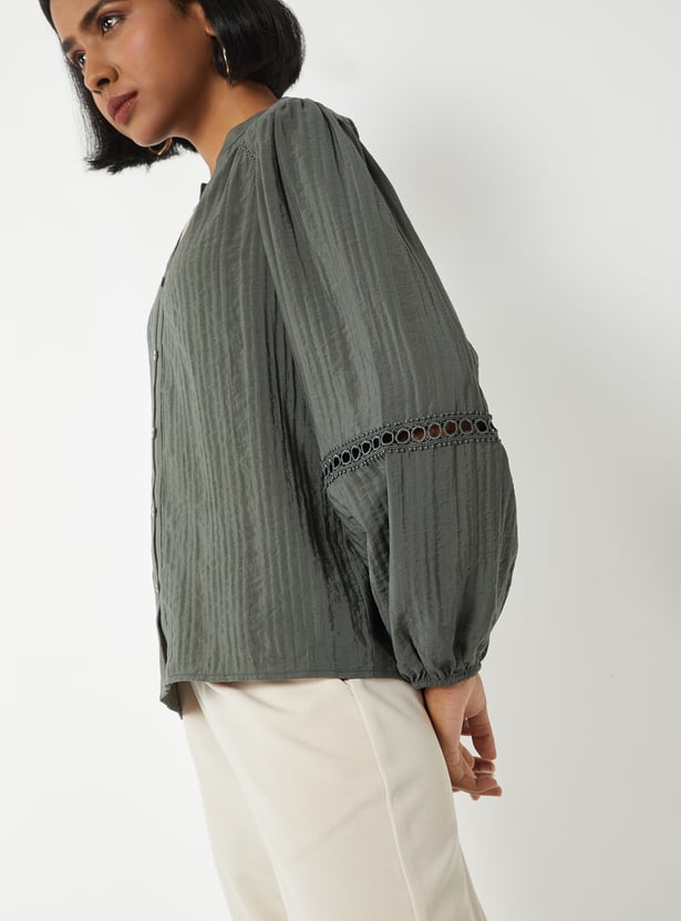 Add a touch of elegance to your wardrobe with this textured blouse, featuring a band collar, button placket, and graceful bishop full sleeves.