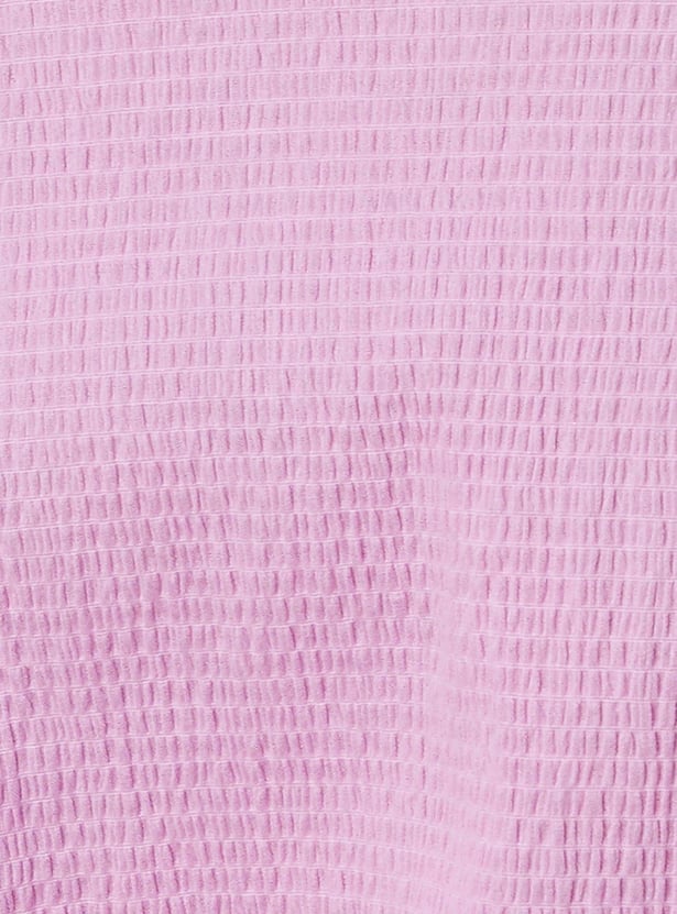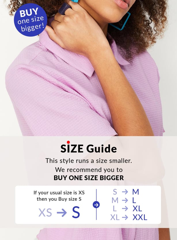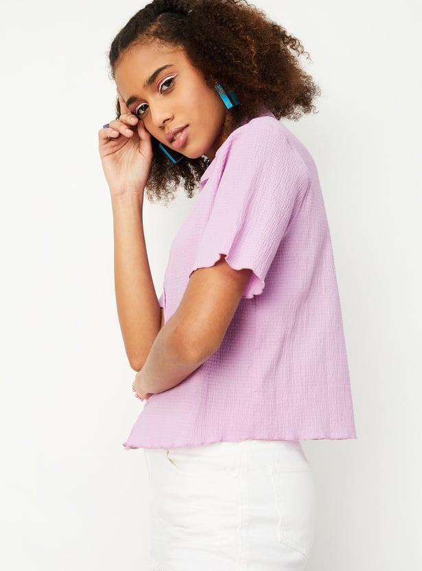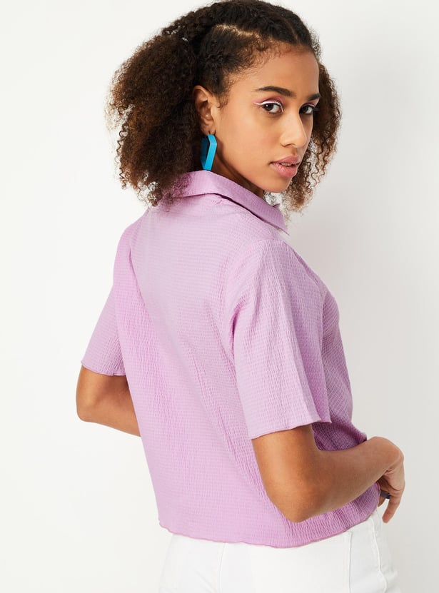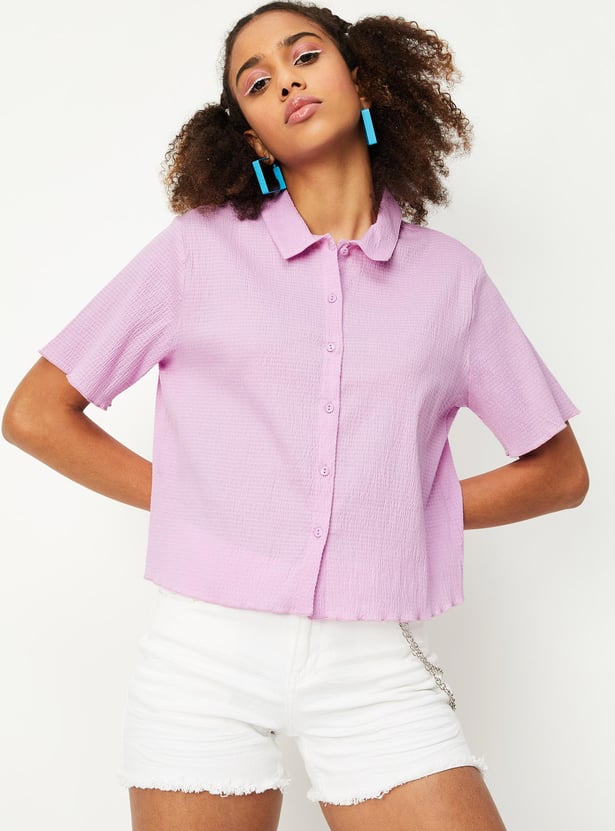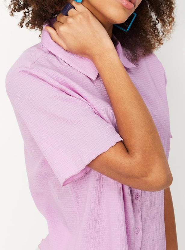 Give your casual wardrobe a much-needed upgrade with this textured shirt. It is tailored in a boxy profile with a spread collar, short sleeves, a button-down front, and a cropped hem. Pair this shirt with denim shorts and sneakers for a summer-ready look.