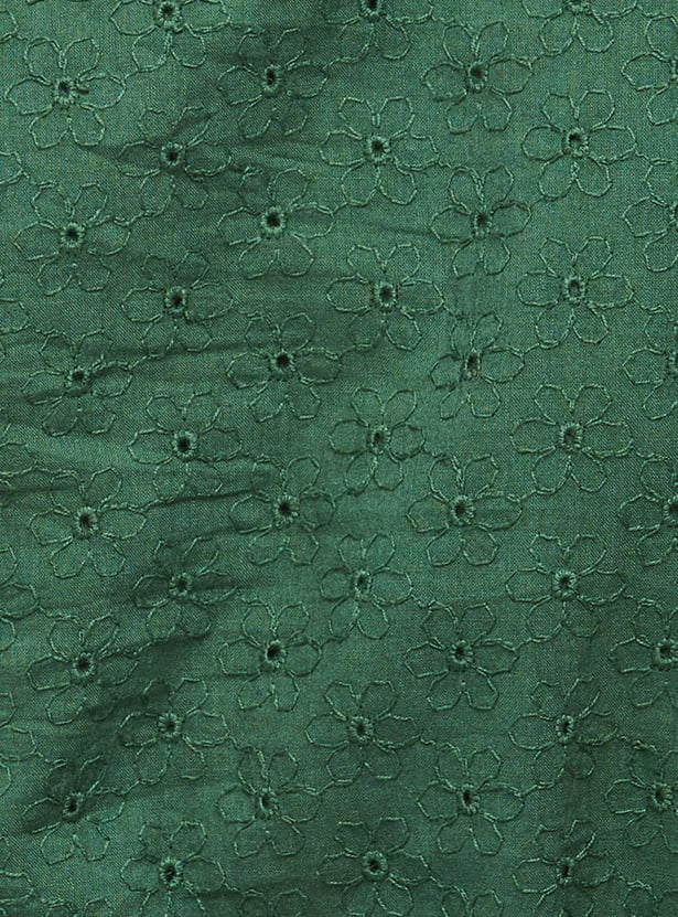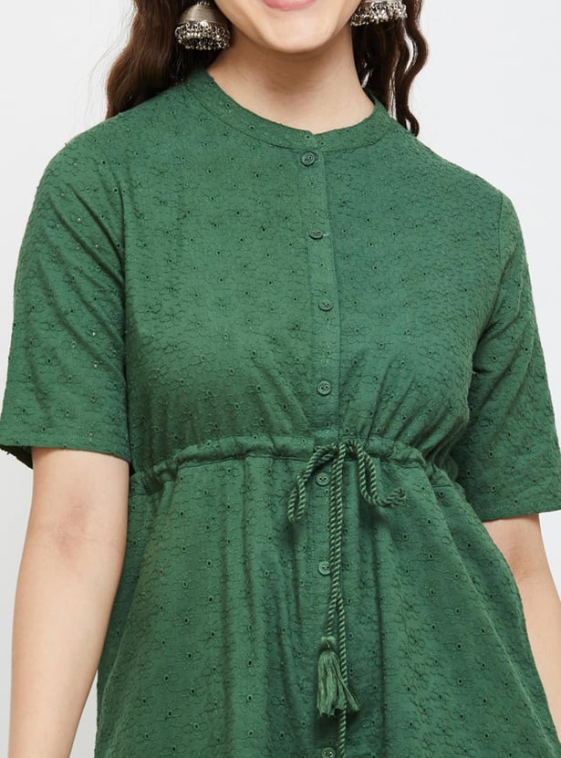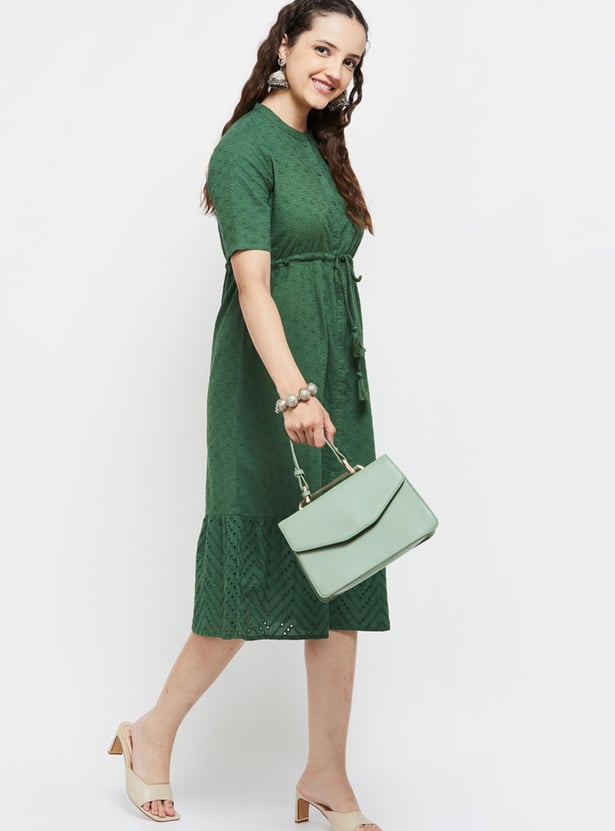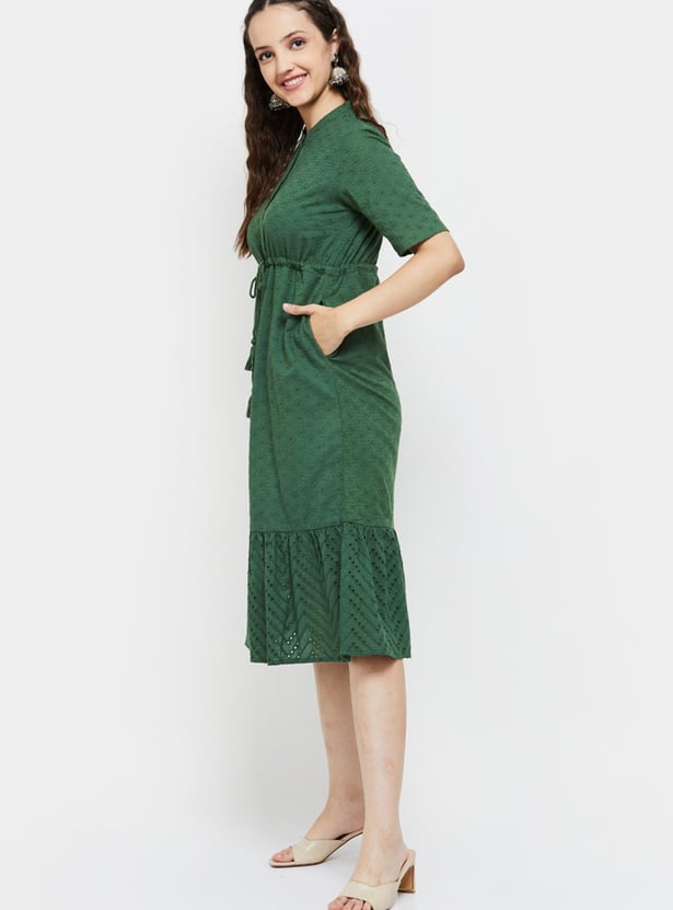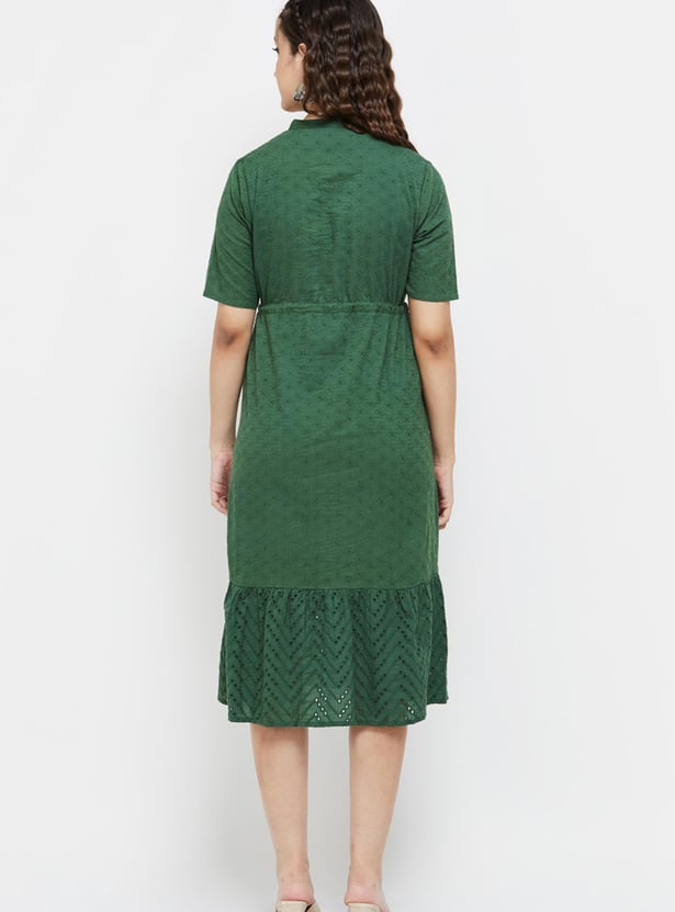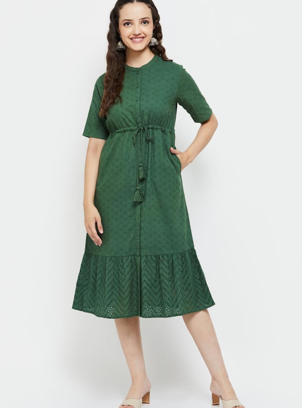 Elevate your casual look with this textured midi dress designed with a band collar, and button placket. and half sleeves.