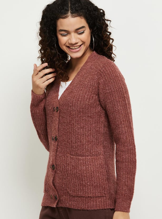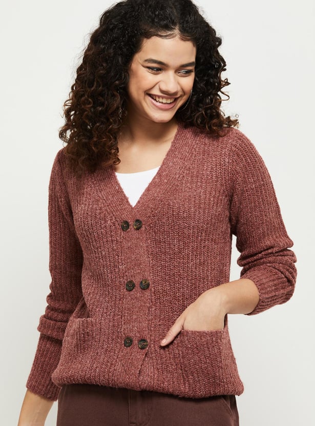 Stay warm and stylish in this knit cardigan styled with a V-neckline, long sleeves, double buttoned front, waist pockets, and ribbed trim. Layer up this cardigan over a T-shirt and team it up with cargo pants and chunky sneakers for a casual day out.