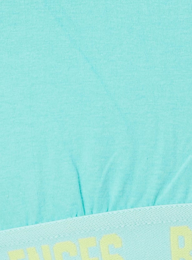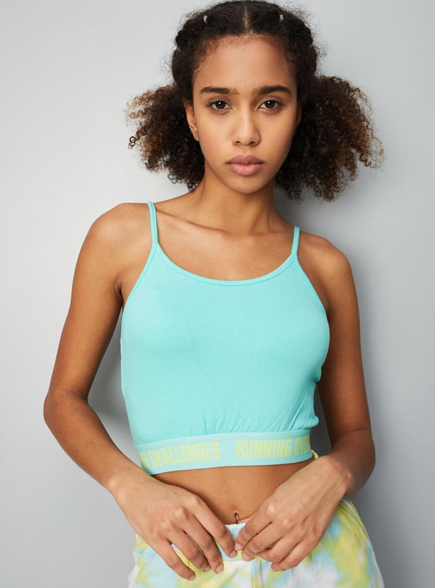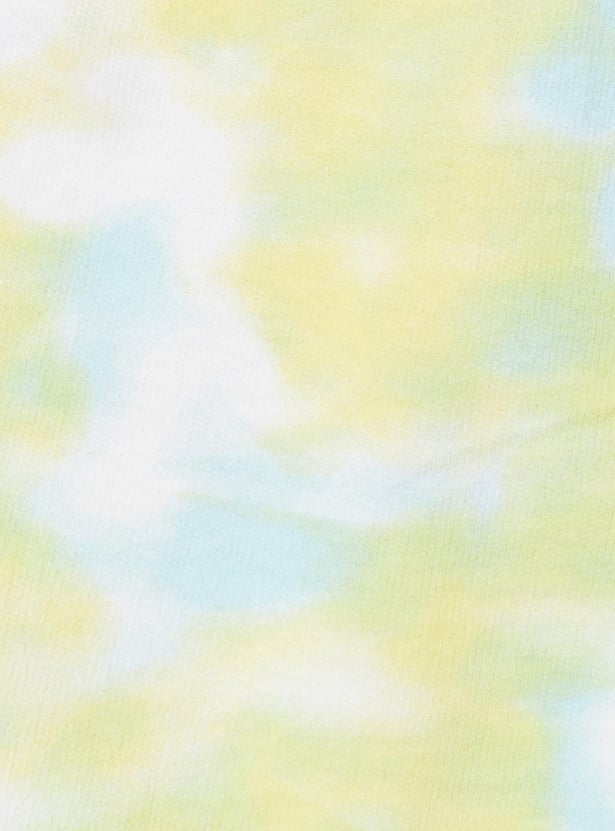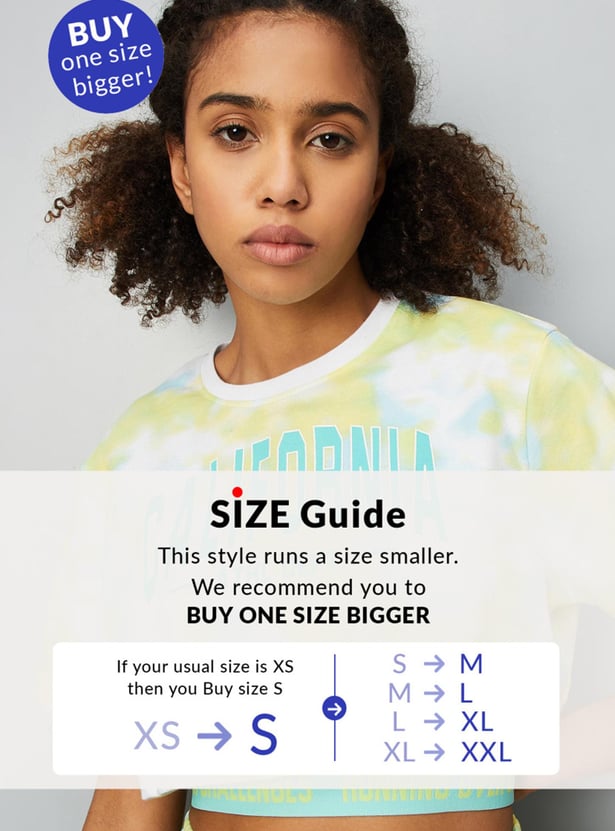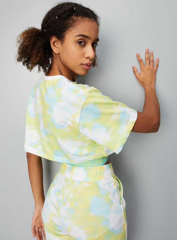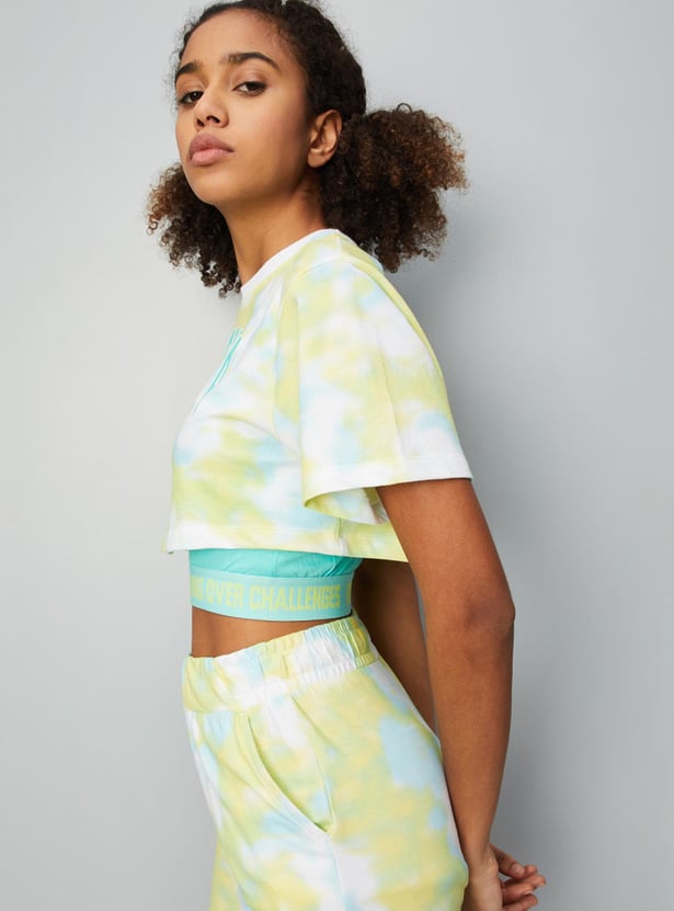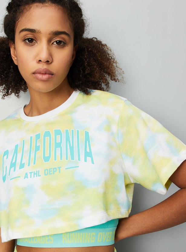 Slay your workout look in this T-shirt crafted in a crop profile. It features a layered design with a tie and dye pattern, a typographic print on the chest, a round neck, short sleeves, and a printed elastic underlayer. Style this tee with shorts and sneakers to look gym ready.