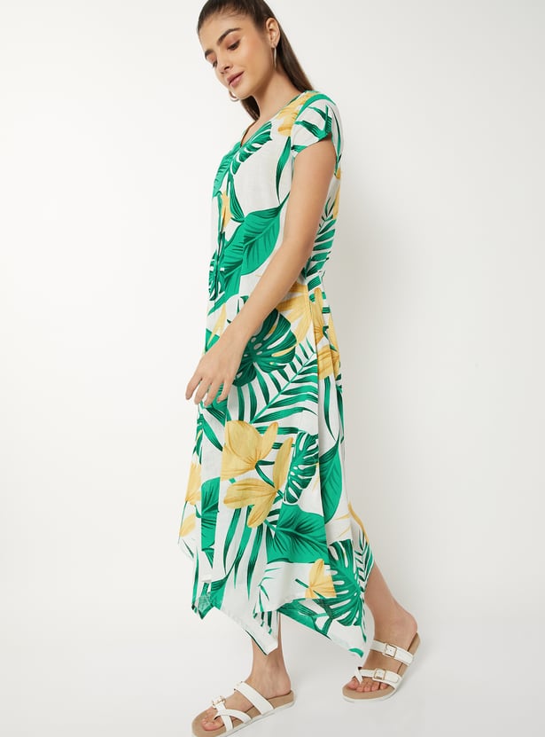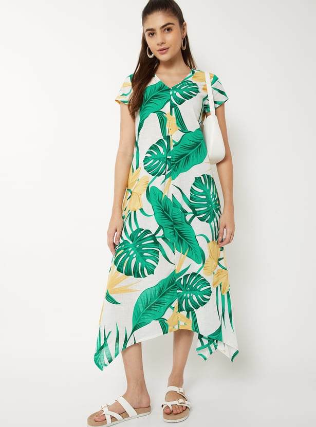 Embrace effortless elegance with this tropical printed hem dress, designed with a flattering V-neck and comfortable half sleeves. Featuring an inverted pleat at the front for added movement and shape, along with practical waist pockets, it blends style with functionality. The flowing handkerchief hem and a graceful midi length complete the look.