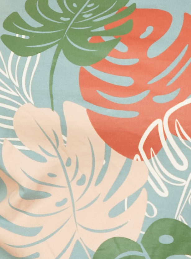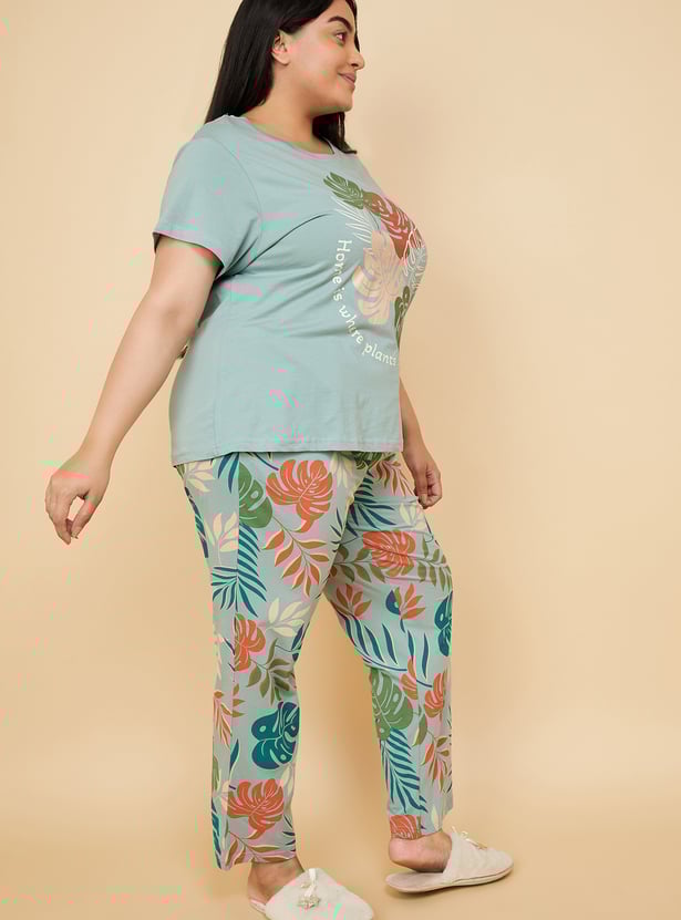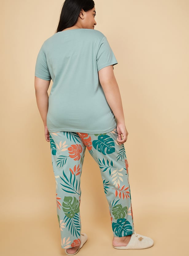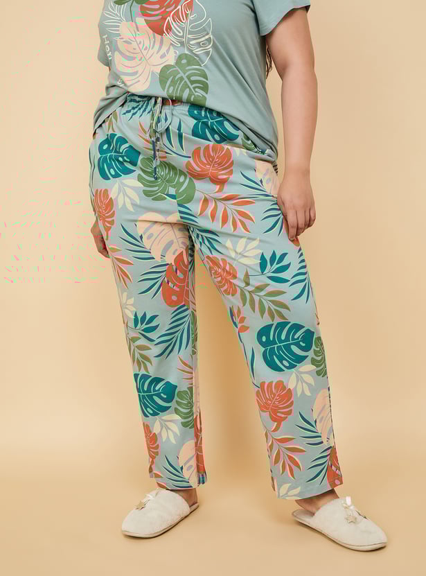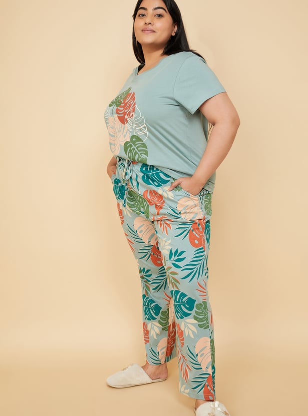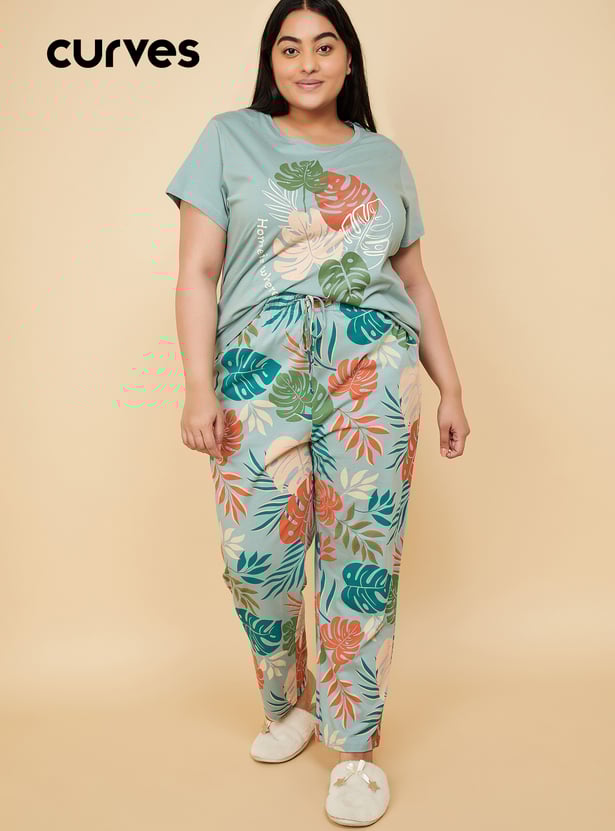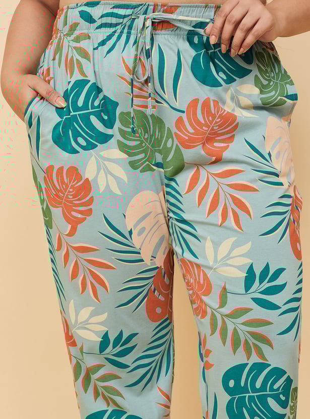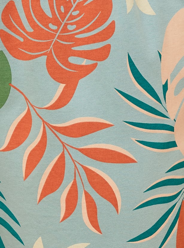 Relax in tropical style with this printed sleepwear set. It includes a T-shirt with a round neck and half sleeves, paired with matching pyjamas featuring an all-over tropical print, elasticated waist, and drawstring for a comfy fit.