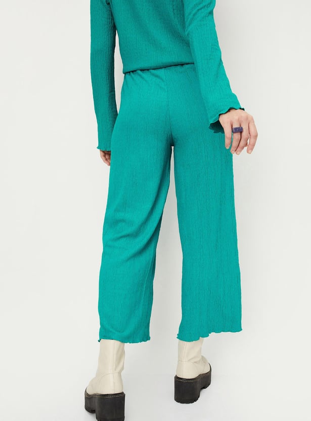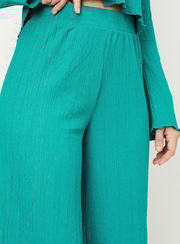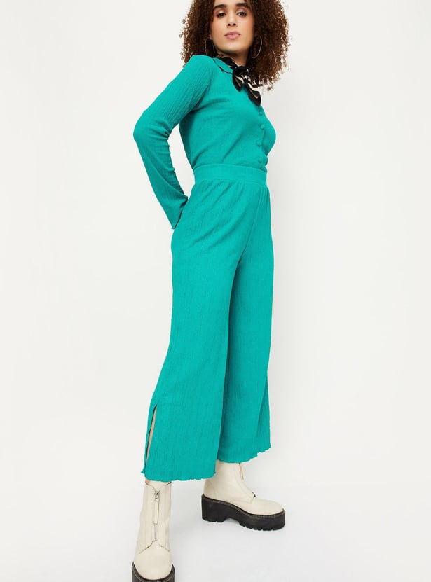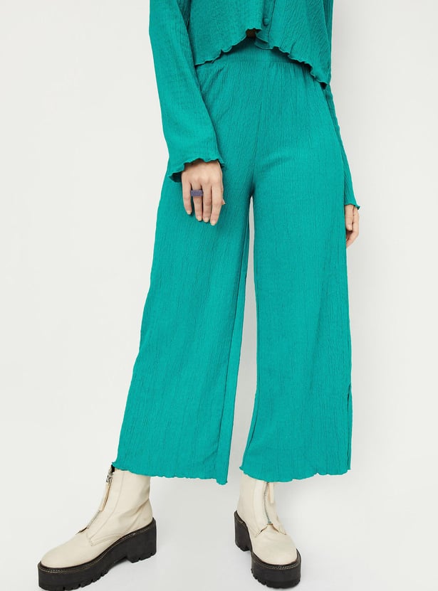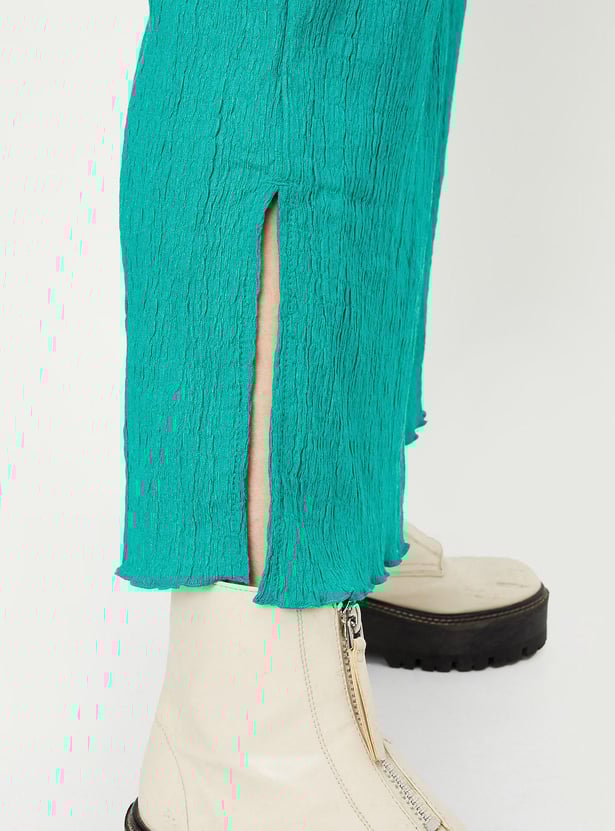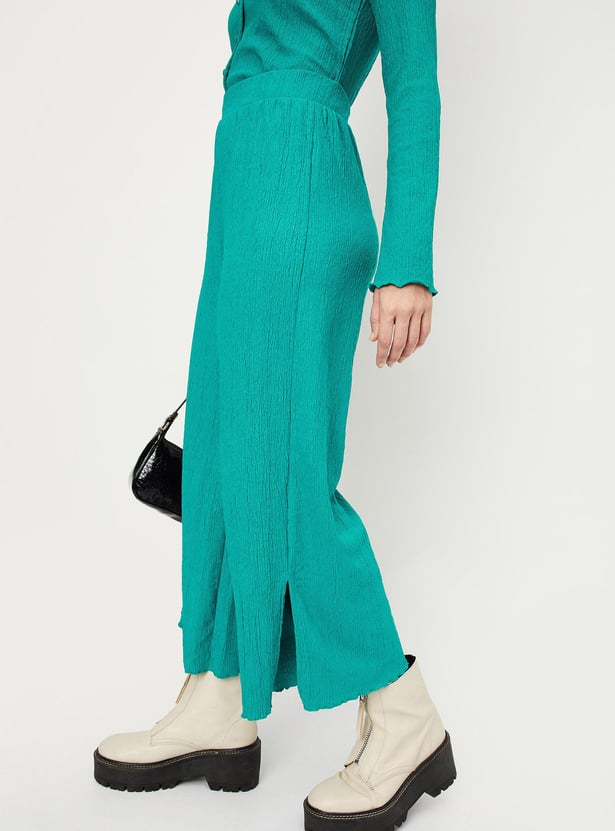 Ensure comfort and style with this pair of pants. It comes with a wrinkled design, an elasticated waistline, a side slit and a full-length construction.