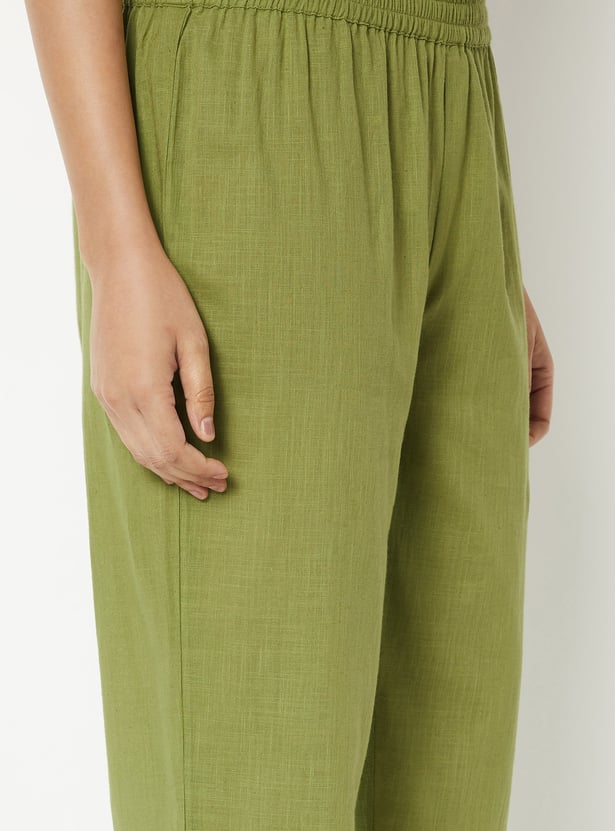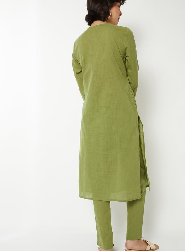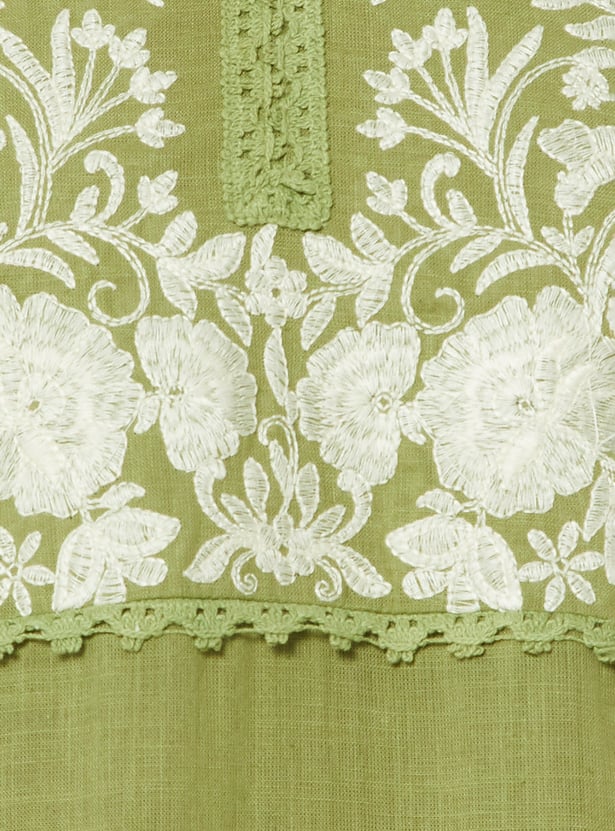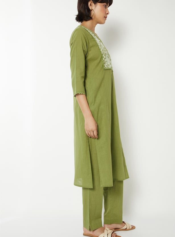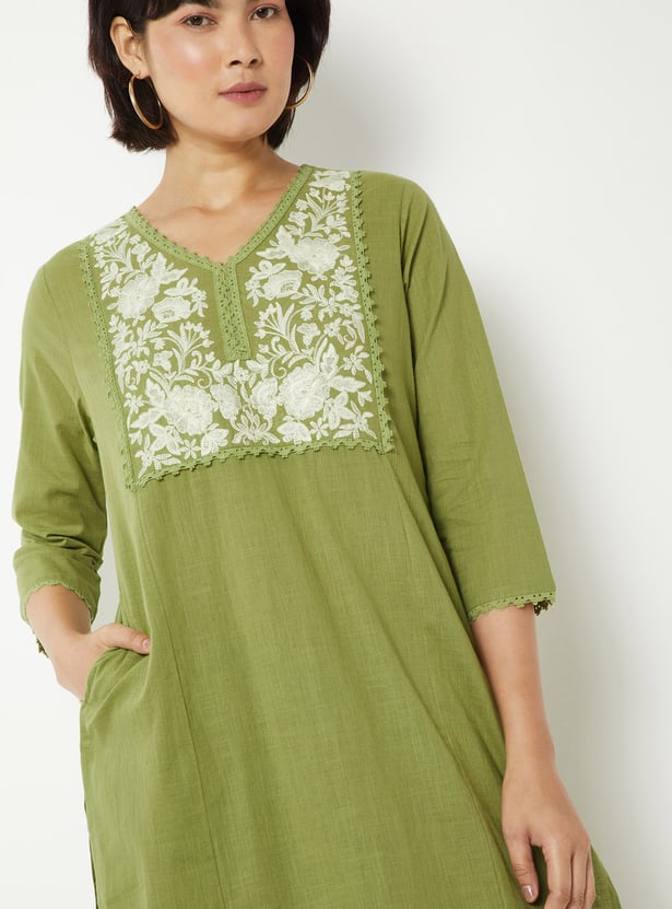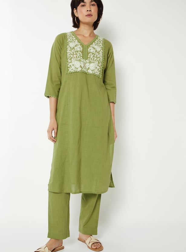 This yoke embroidered co-ords set features a V-neck top with intricate embroidery on the yoke, a convenient side pocket, and 3/4 sleeves for a polished, elegant look. The coordinating bottoms complete the set, making it effortless to style for both casual and semi-formal occasions.