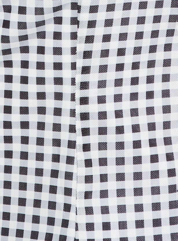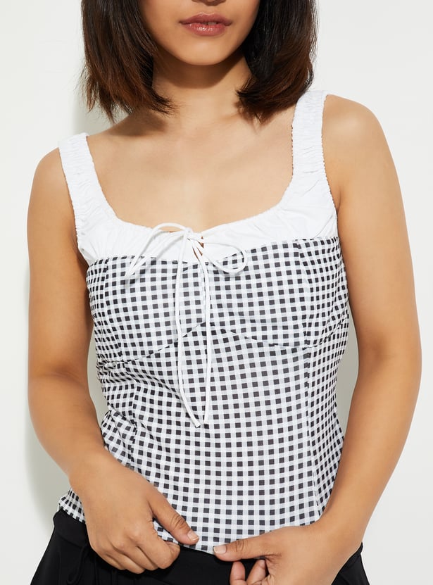 Level up your urban style with this woven top featuring a checked pattern and ruching details at the straps and neckline for cool texture. The design offers a snug, comfortable fit, while a playful bow at the front adds a youthful touch. Perfect for a fun, city-ready look.