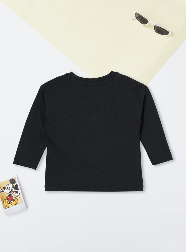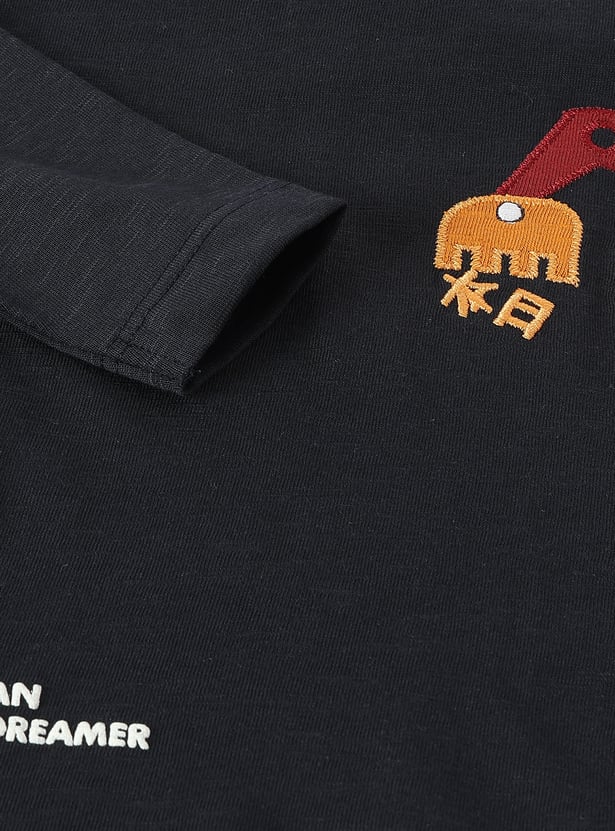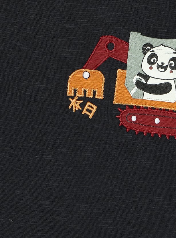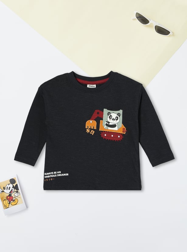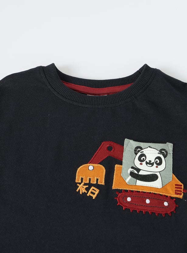 Add a fun twist to your kid's casual wardrobe with this T-shirt. It is styled with an embroidered design along with a patch pocket, a crew neck, and full sleeves.