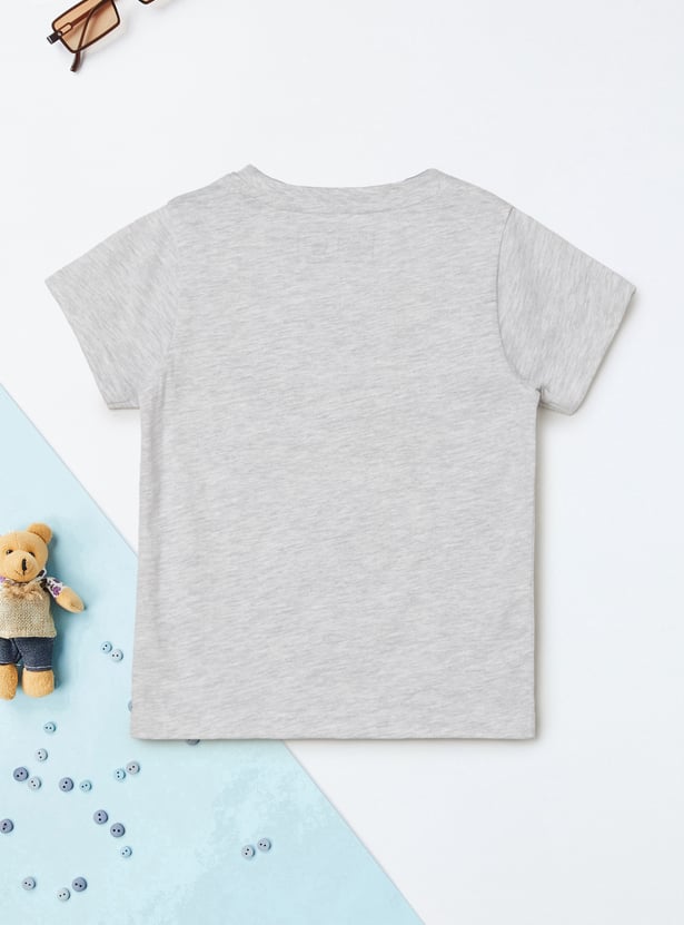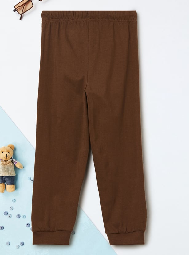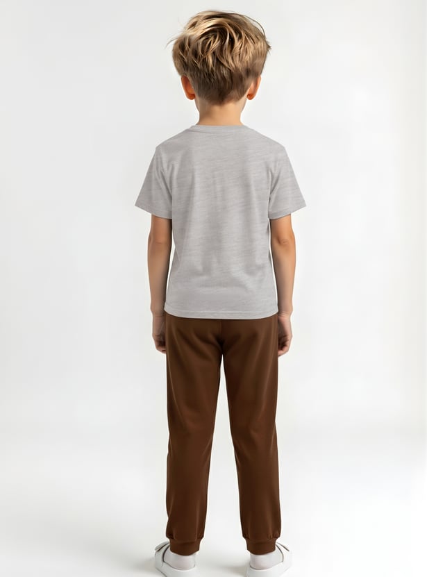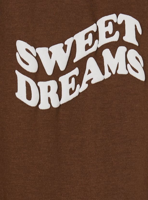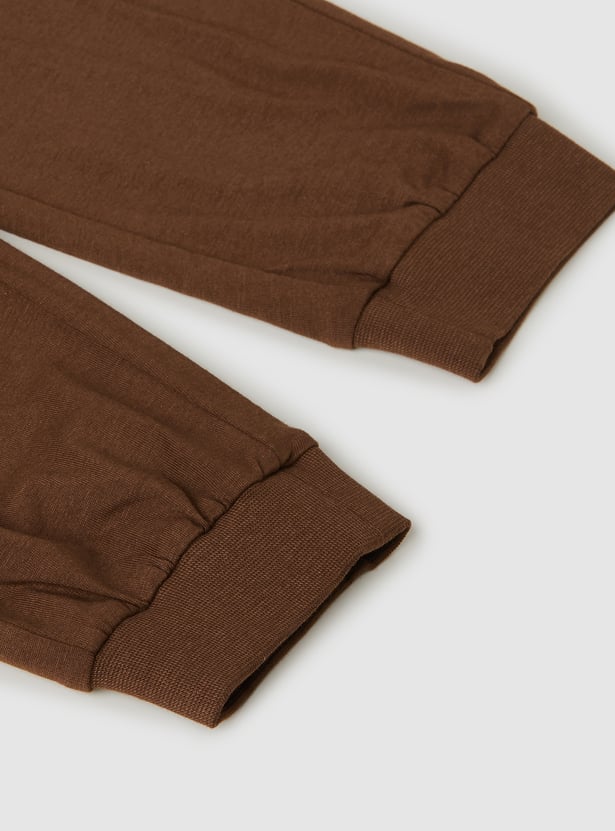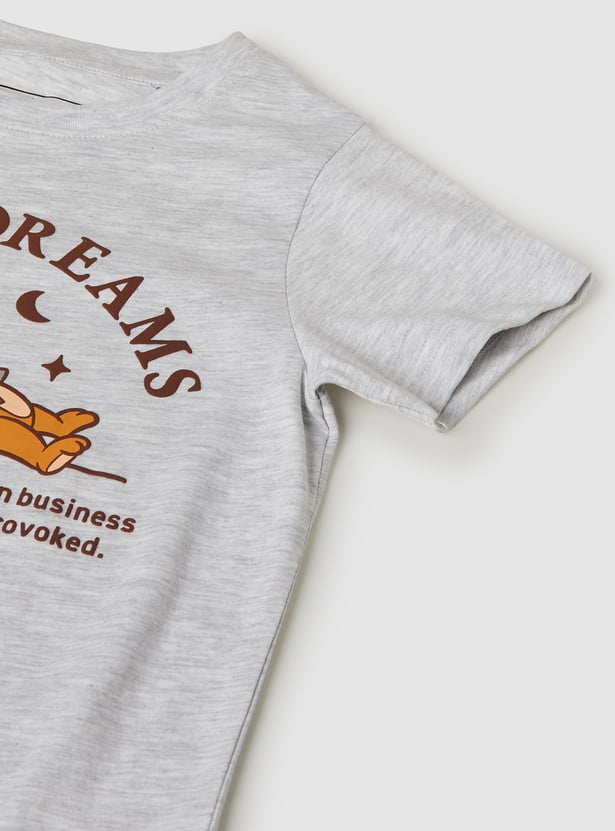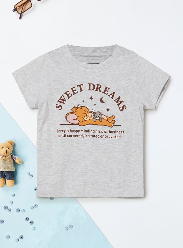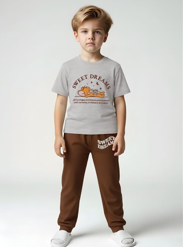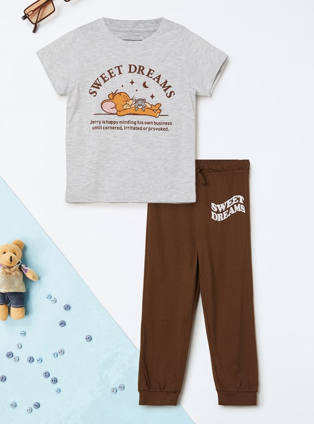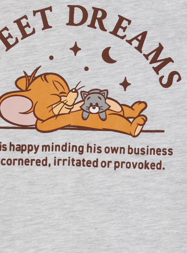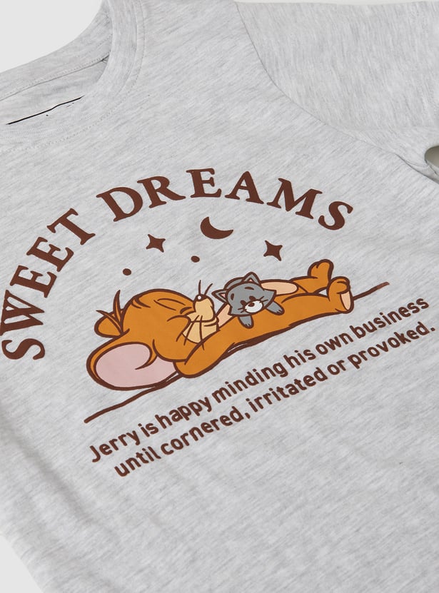 This Jerry print PJ set brings playful charm to your bedtime routine. The soft round neck t-shirt with half sleeves is paired with matching printed joggers featuring a drawstring waist, ensuring all-night comfort and cuteness.