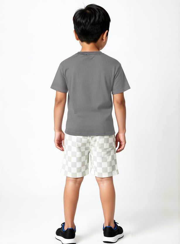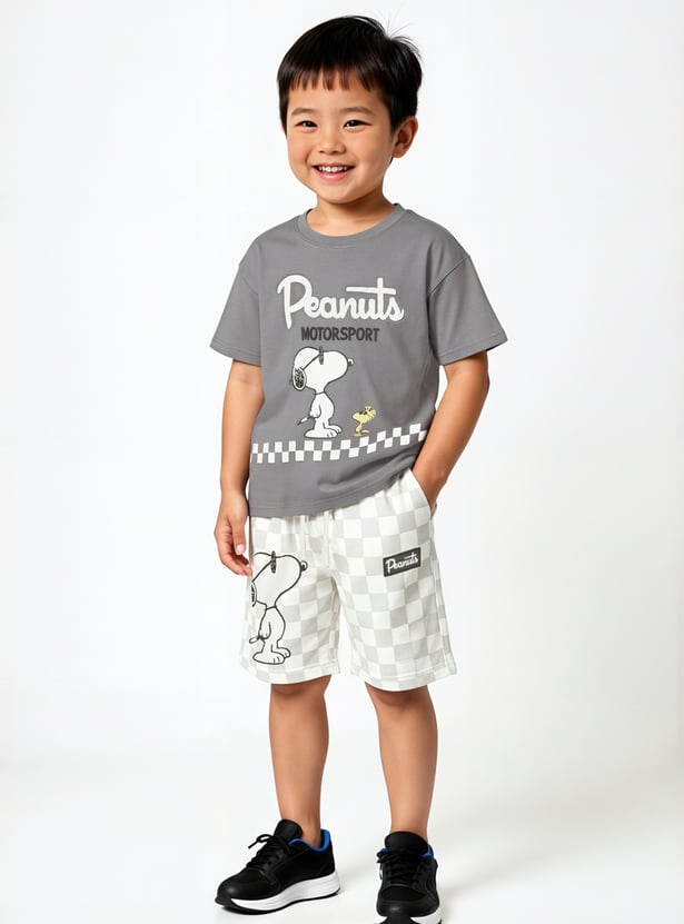 Bring fun to everyday wear with this Peanuts print shorts set. The T-shirt features a crew neck and half sleeves, paired with joggers designed with a drawstring closure and pockets for comfort and ease.