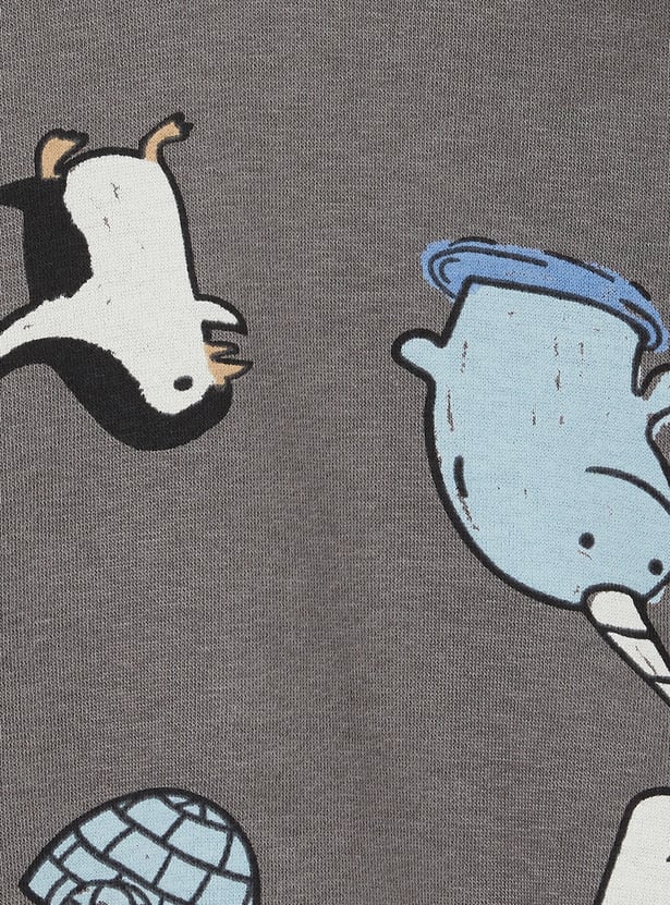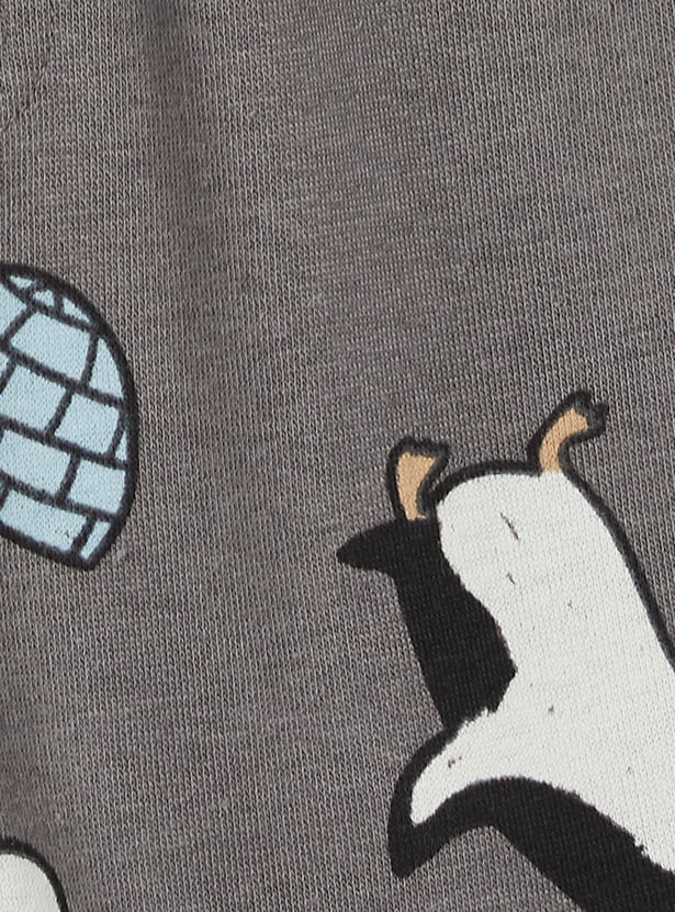 Stay stylish and comfortable in this printed hooded joggers set. The T-shirt features a hooded neck and full sleeves for a sporty vibe, while the joggers are designed with a drawstring closure and practical pockets for added ease.