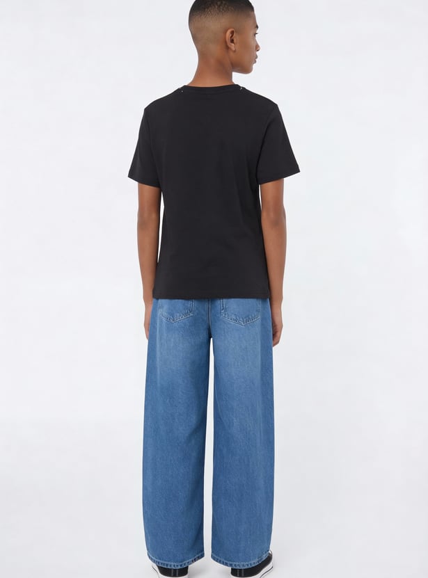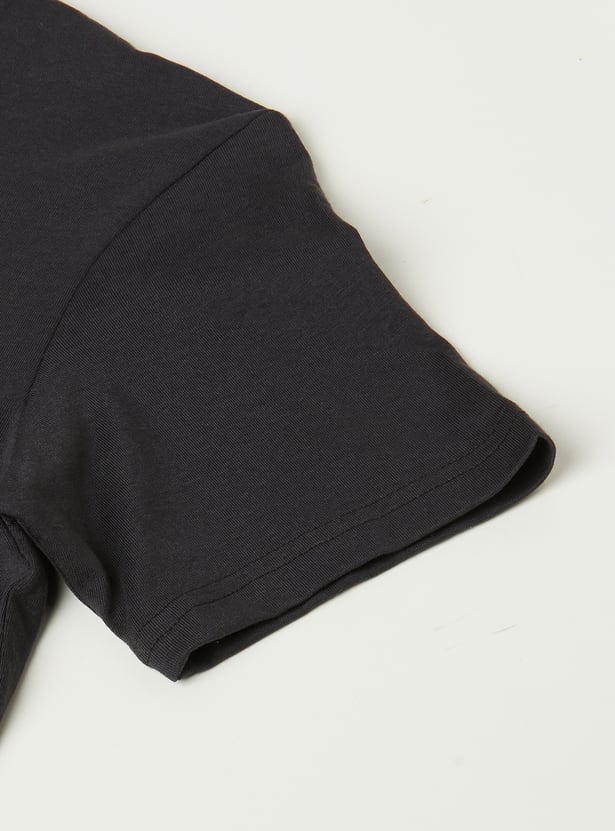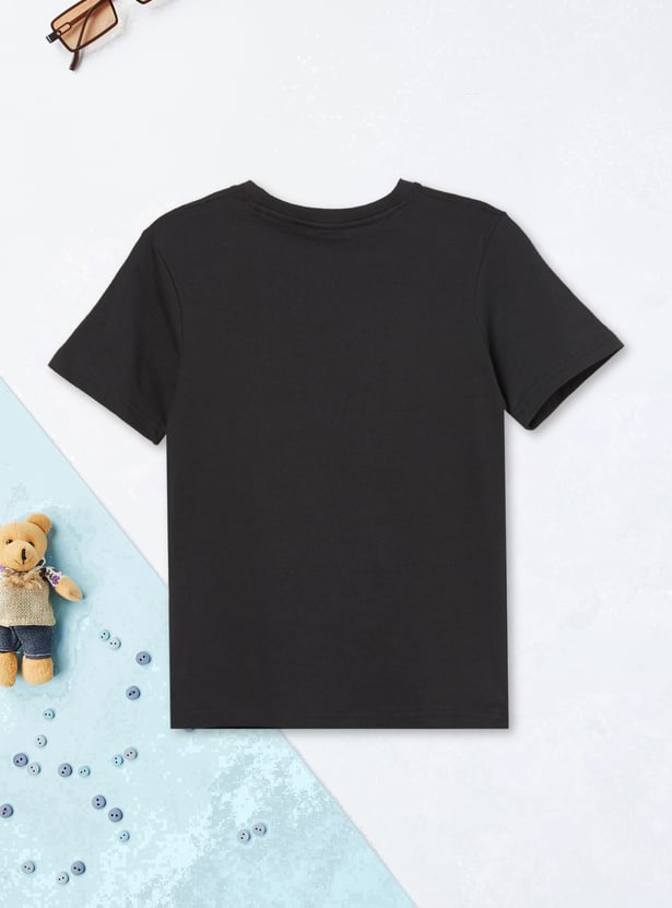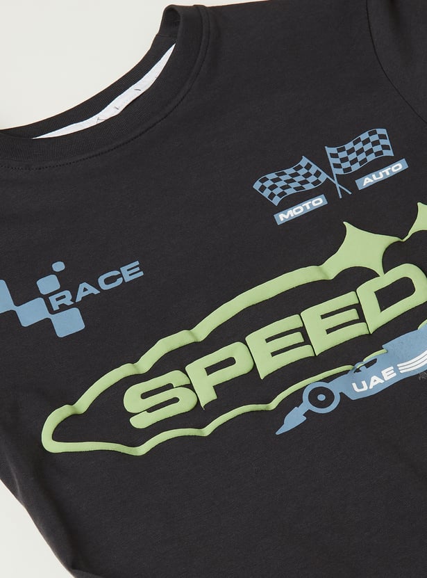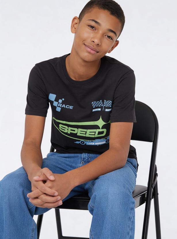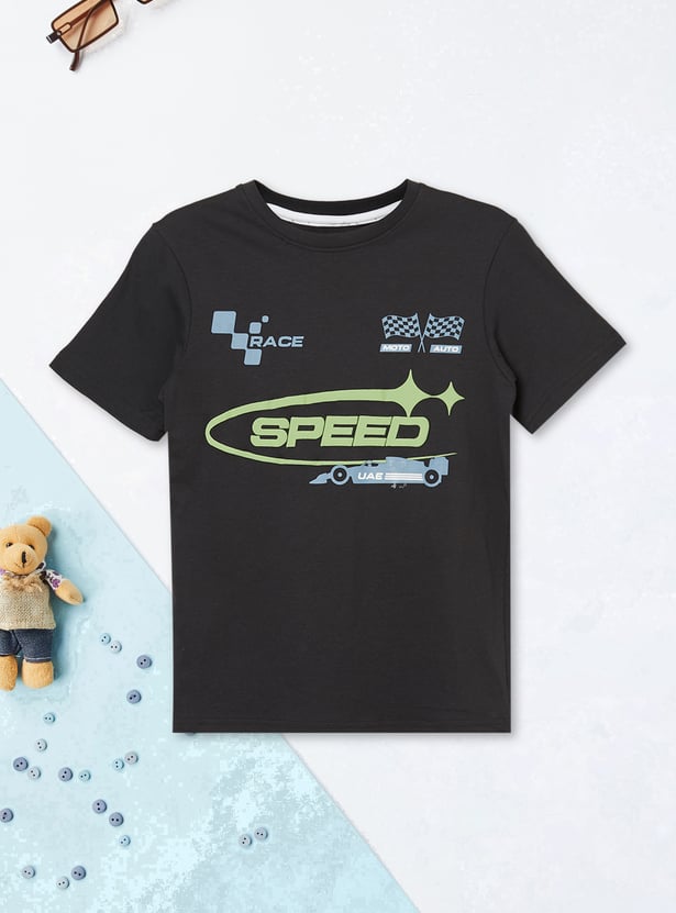 This printed T-shirt features a classic crew neckline and half sleeves for comfortable, all-day wear. The clean silhouette and graphic print make it a versatile choice for casual styling and playtime.
