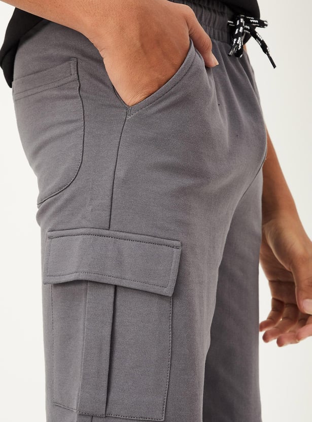 Perfect for playtime with friends, this pair of shorts keeps him comfy and stylish. It is designed with a drawstring waist, cross pockets, a back patch pocket, and side cargo pockets with a print.