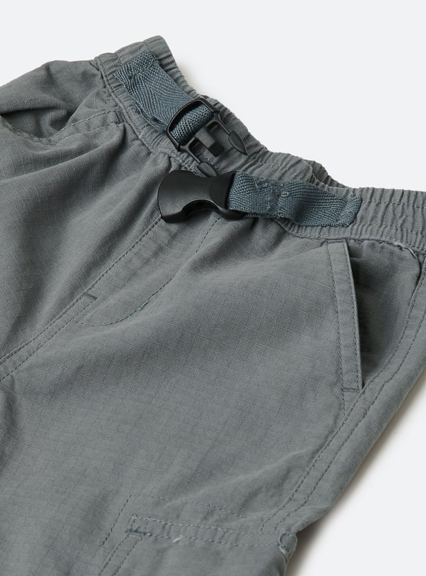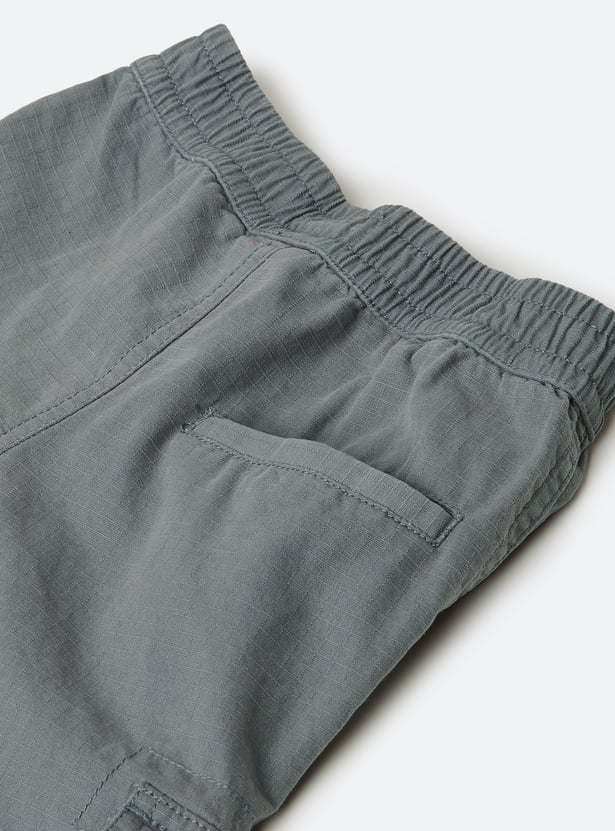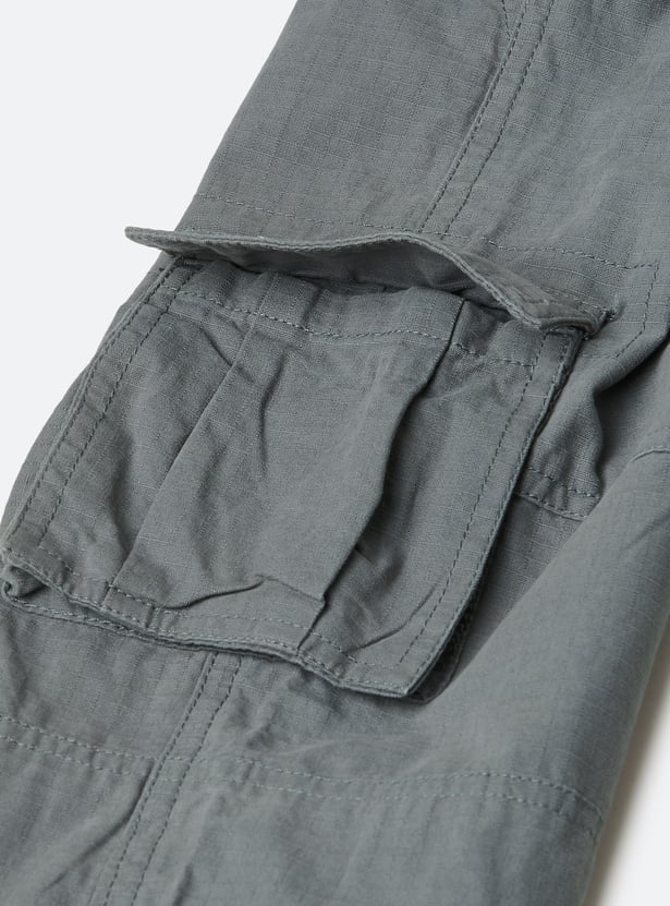 These mid-rise textured cargo trousers combine style and practicality with a rugged finish. Featuring multiple pockets for utility and a belted waist for a secure, adjustable fit. Perfect for active days and casual outings.
