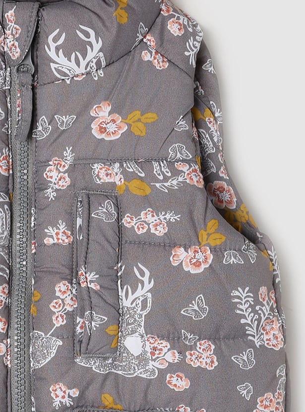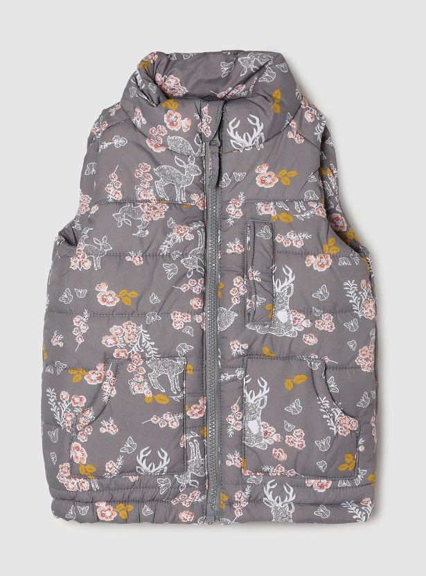 Elevate your little one's casual look with this bomber jacket designed with floral prints, zip closure, pockets, and a sleeveless silhouette.