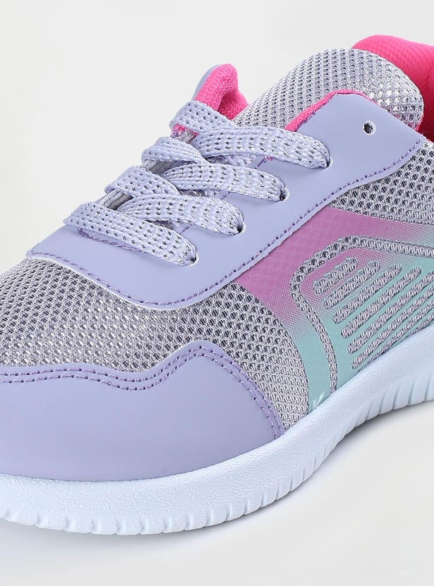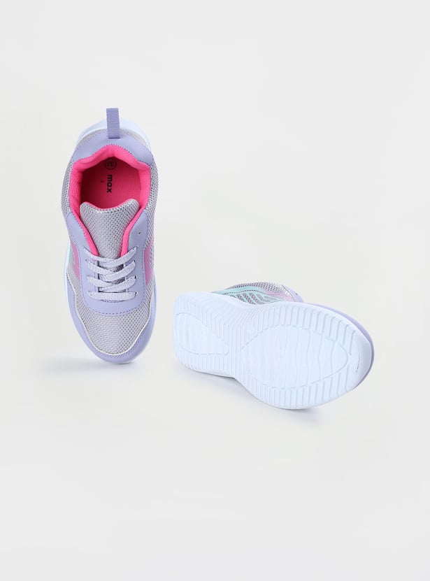 A perfect mix of sporty and glam, this pair of shoes is updated with iridescent panels, round toe, printed sides, and a lace-up panel. This pair features a back heel tab, padded collar and tongue, cushioned footbed, and durable outsole.