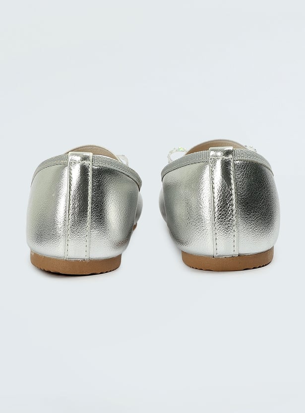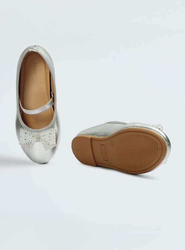 She'll shimmer and shine with this pair of ballerinas. Featuring a metallic upper, bow embellishments with a midfoot strap, a padded footbed, and a durable outsole, these ballerinas add a touch of sparkle and comfort to any outfit.