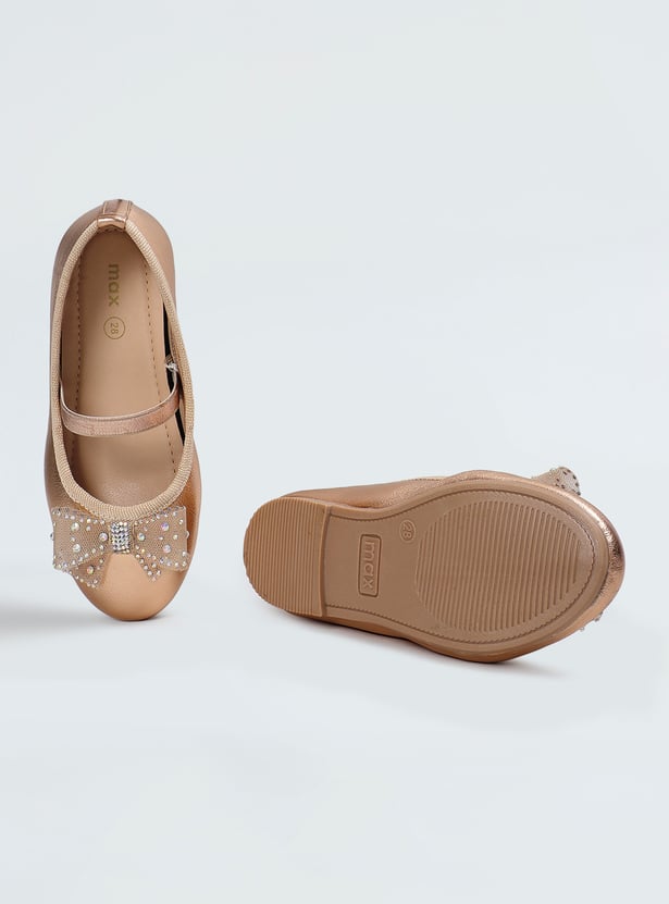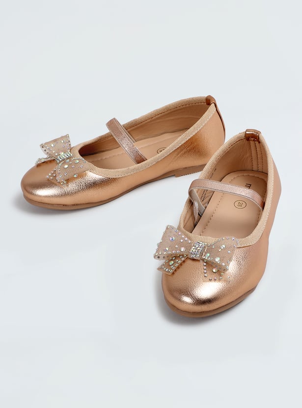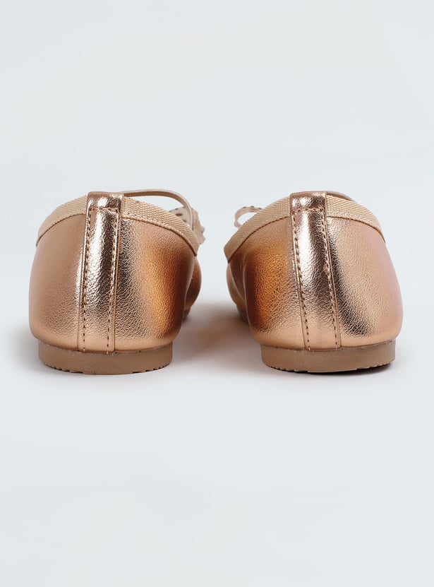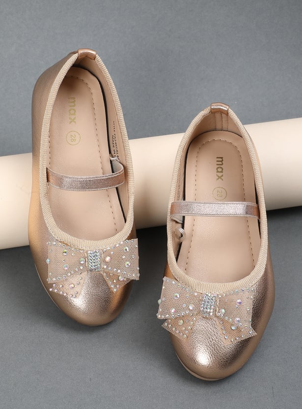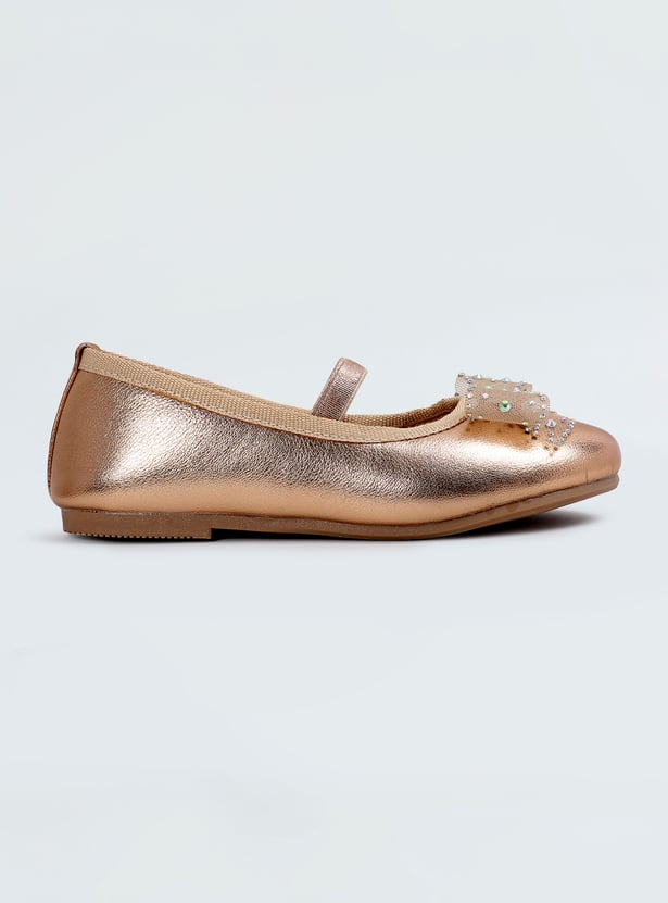 She'll shimmer and shine with this pair of ballerinas. Featuring a metallic upper, bow embellishments with a midfoot strap, a padded footbed, and a durable outsole, these ballerinas add a touch of sparkle and comfort to any outfit.