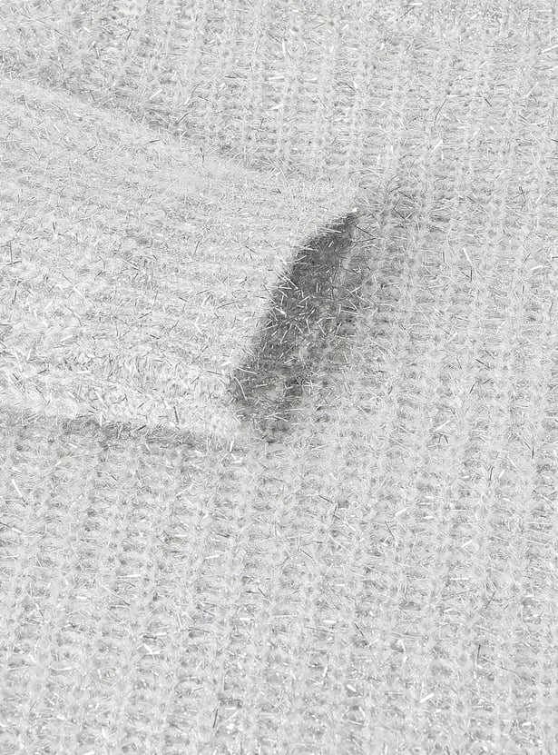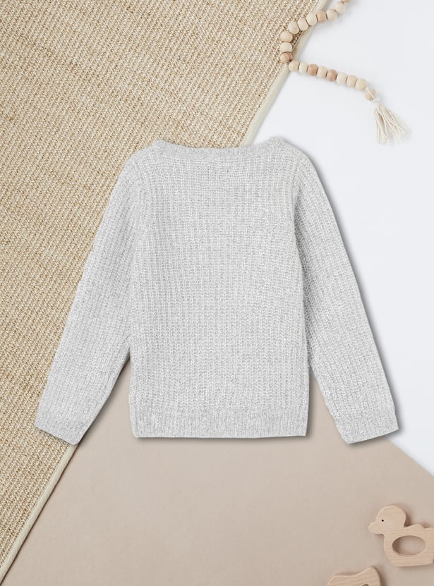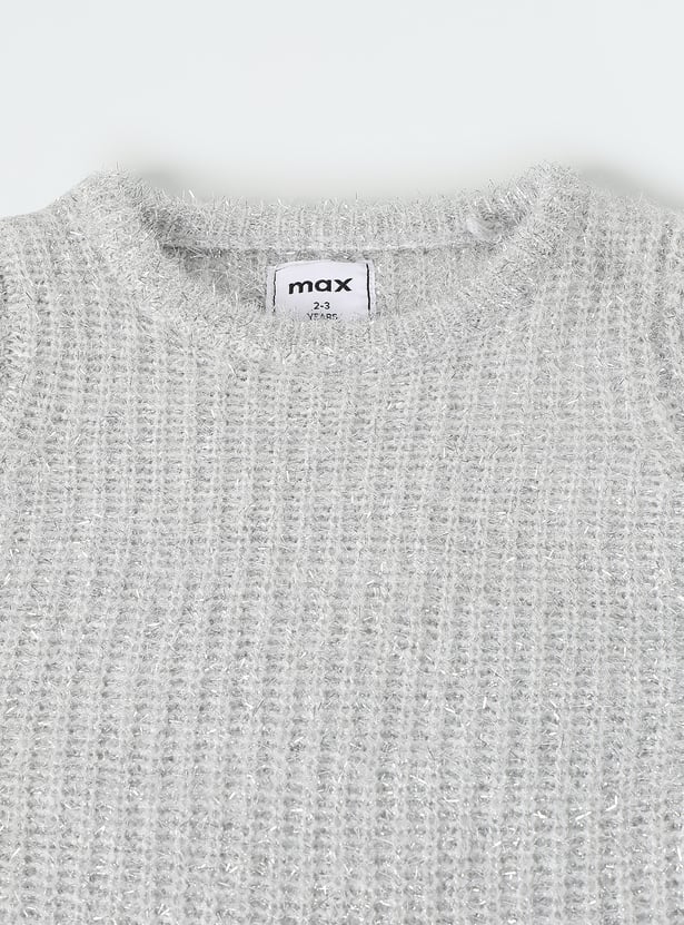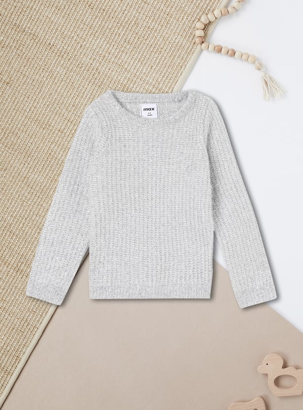 Add just the right amount of shine to her wardrobe with this sweater. It features a subtle metallic sheen that catches the light, adding a touch of glamour to her everyday look. The soft knit fabric ensures comfort and warmth, while the round neck, full sleeves, and ribbed trim offer a cosy yet chic silhouette.