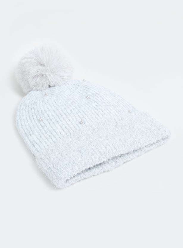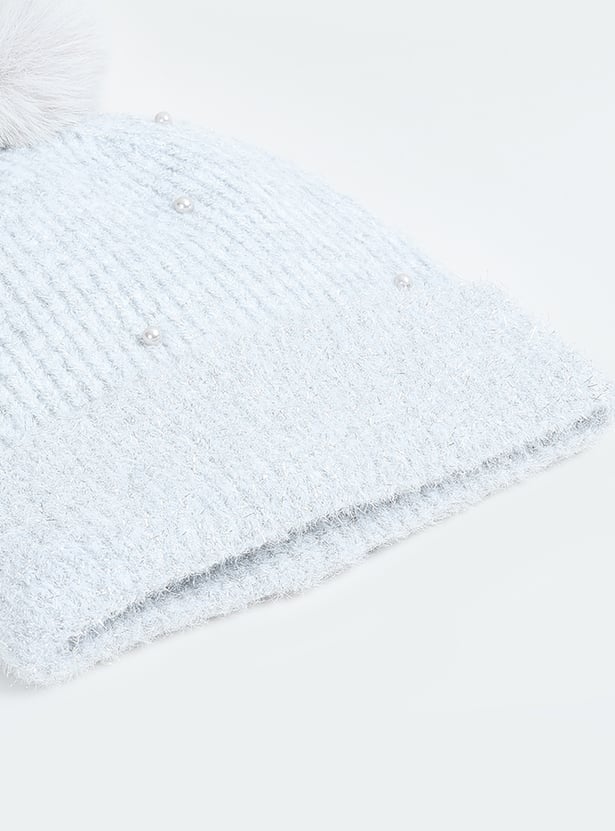 Girls Pearl Embellished Beanie with Pom Pom Detail