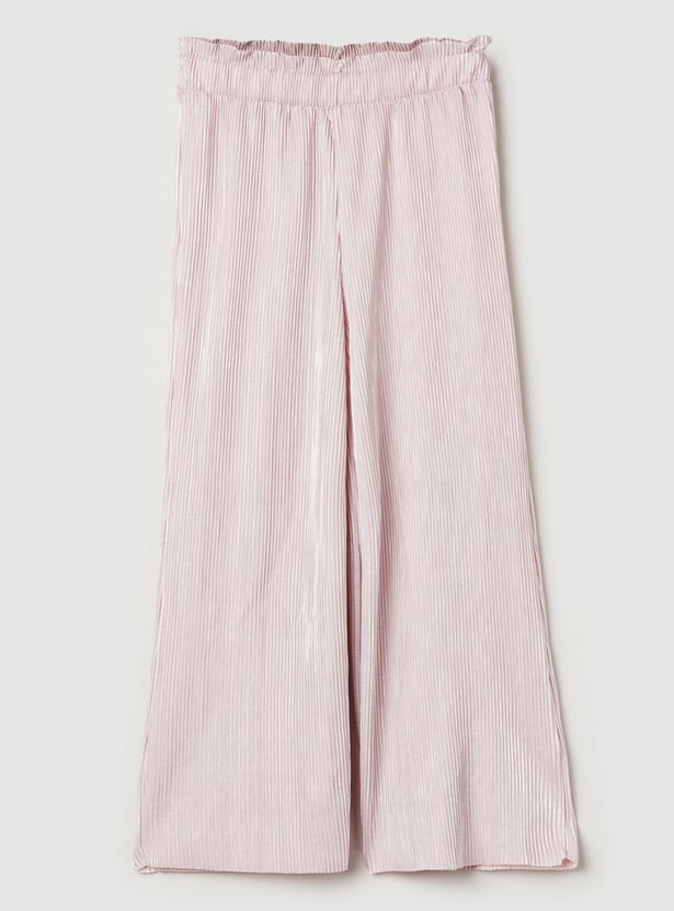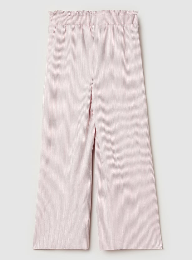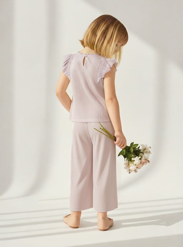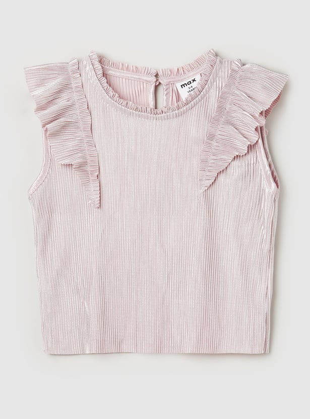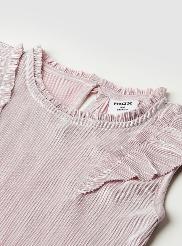 Look stylish with this pleated co-ords set, featuring a sleeveless top with a round neck, front ruffles, and a button closure for a feminine touch. The pleated trousers with an elasticated waist offer both comfort and flair.