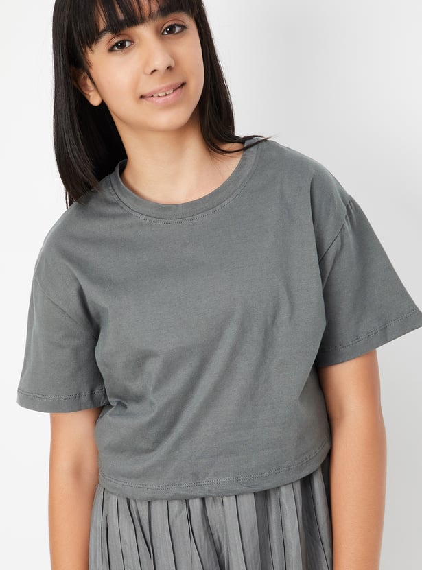 Get a trendy layered look with this pleated dress paired with a round neck half-sleeve t-shirt. The sleeveless pleated dress features a flattering fit-and-flare knee-length silhouette, while the t-shirt adds a casual yet stylish twist.
