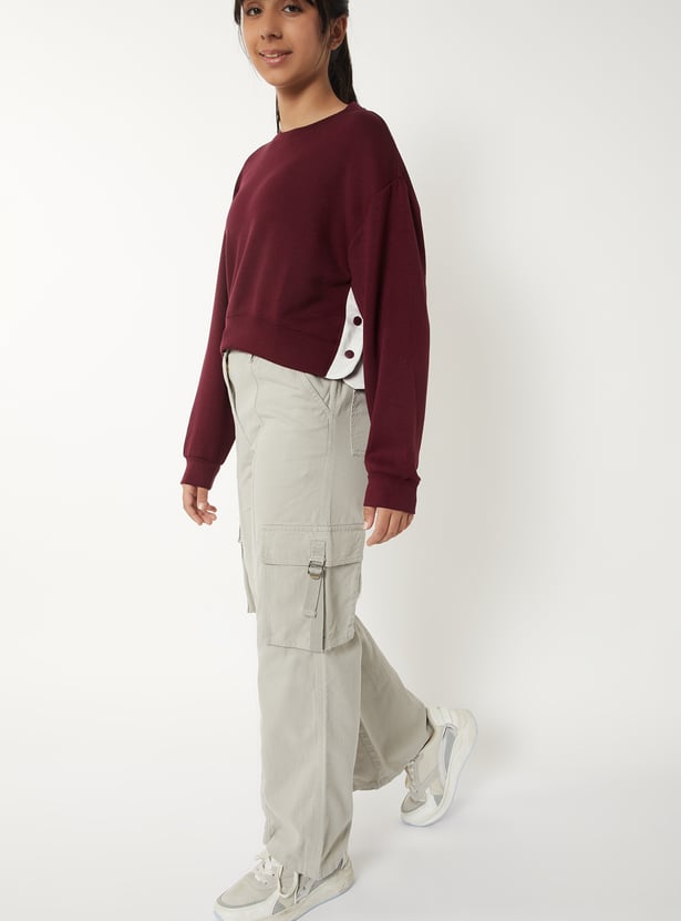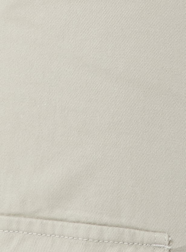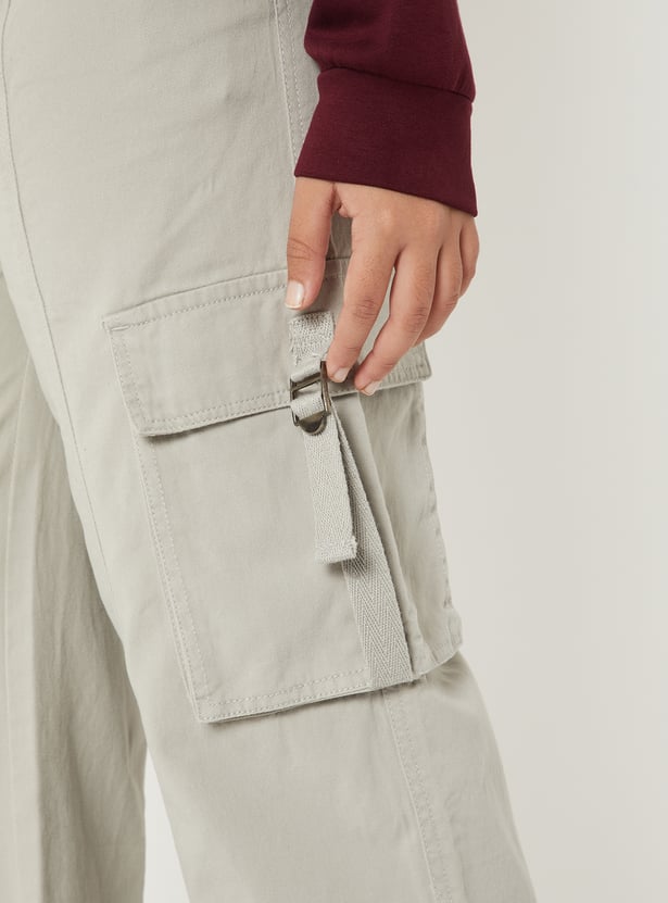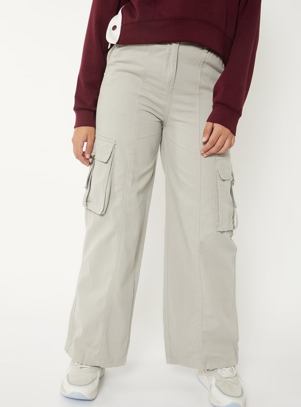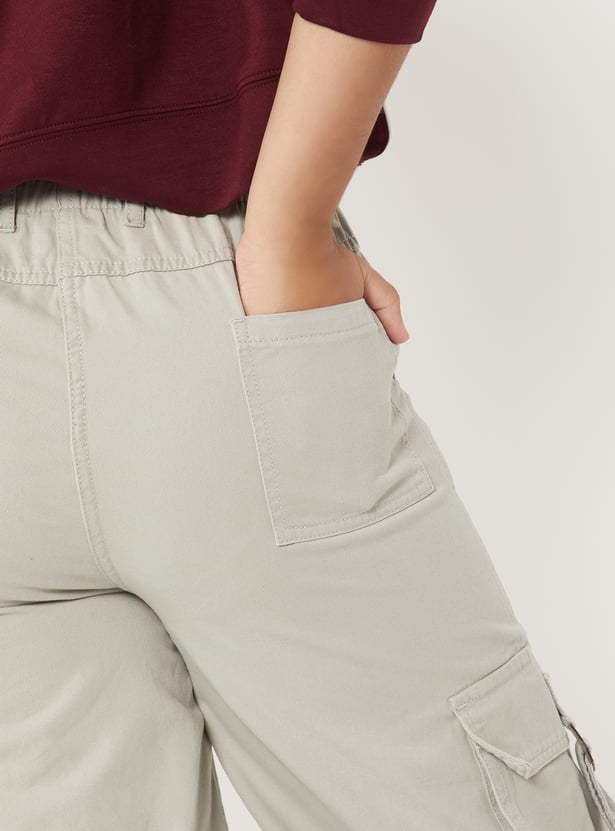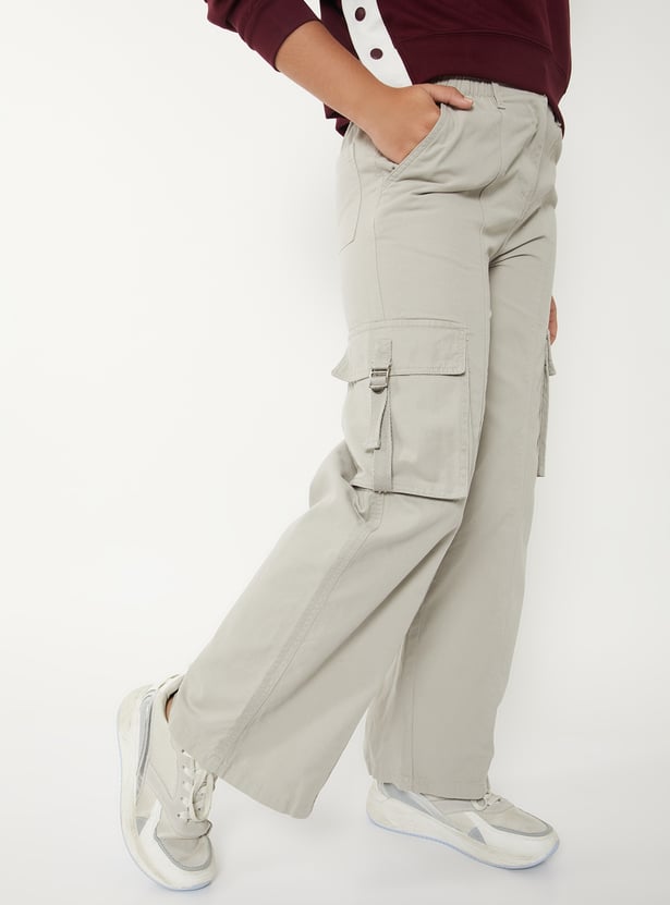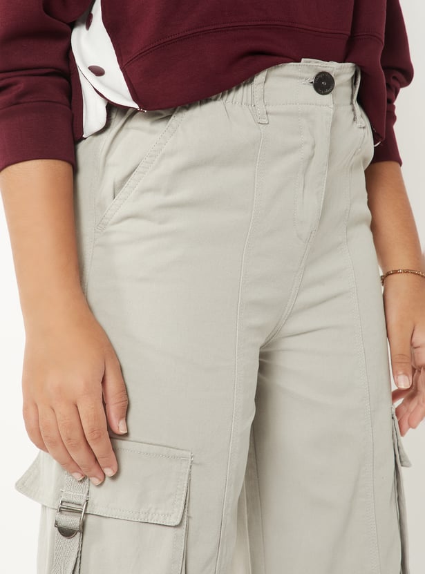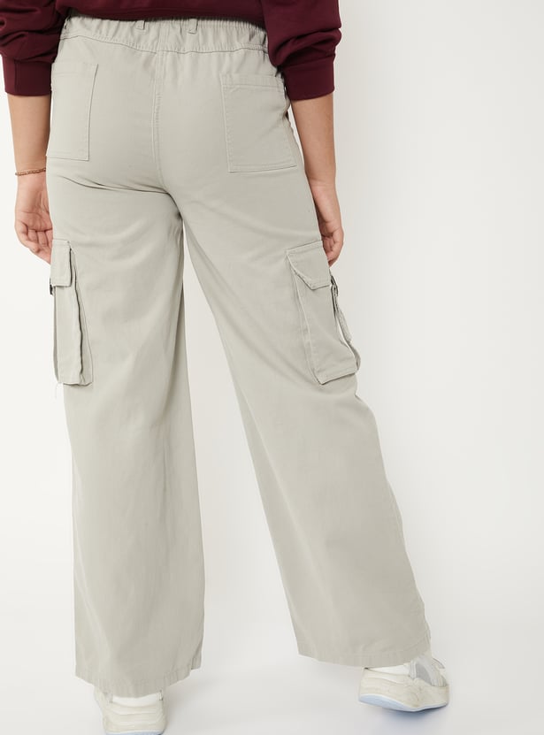 Step into effortless style with these solid wide-leg cargo trousers, designed for comfort and versatility. Crafted from a soft cotton blend, they feature a button and zip closure, multiple pockets, and a partially elasticated waistband for a secure yet flexible fit.