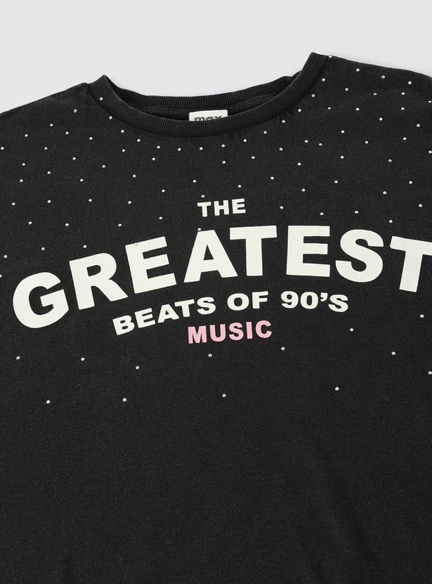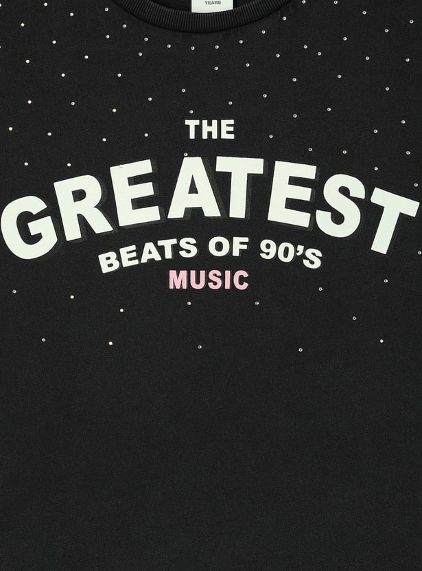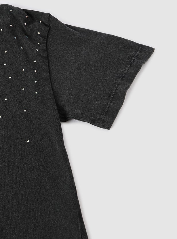 Add a sparkle to her wardrobe with this trendy typographic printed T-shirt. Featuring playful embellishments, half sleeves, and a round neck, it's the perfect choice for sunny days and fun-filled adventures.