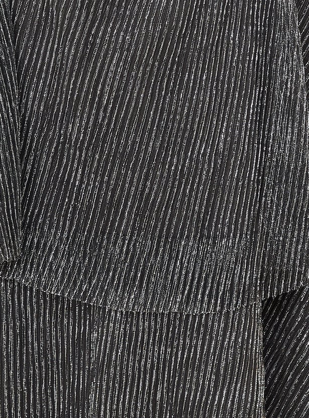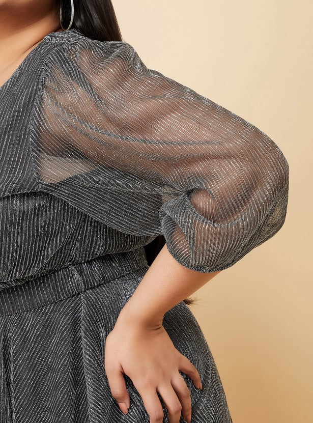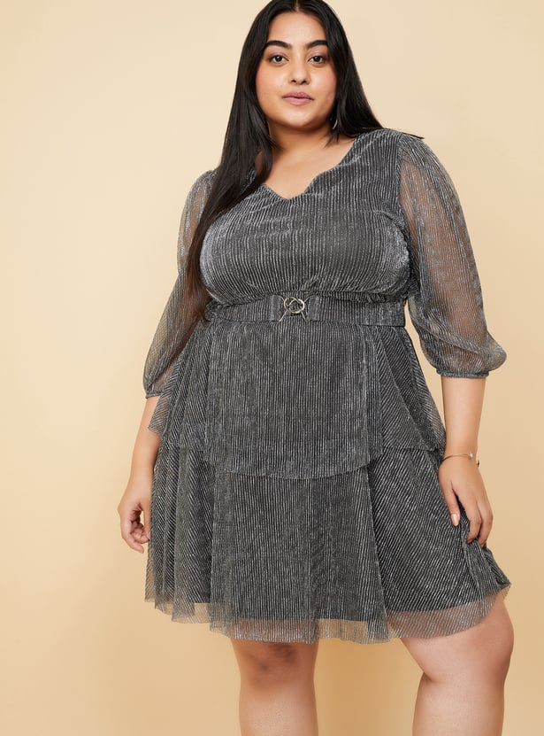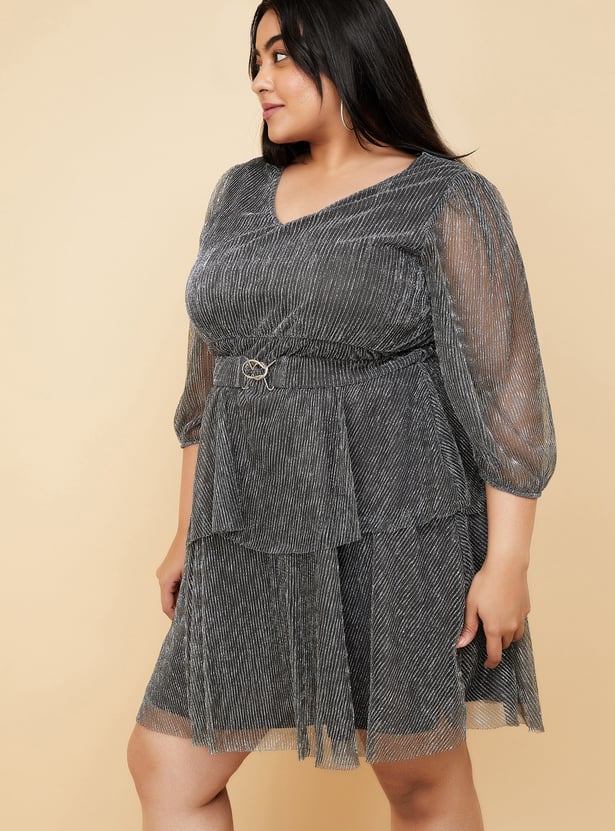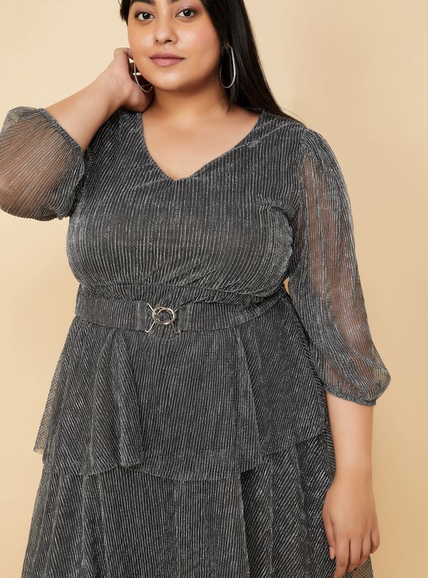 This gorgeous dress features a captivating shimmer design that enhances your charm. It boasts a delightful V-neckline, three-quarter sleeves, a belted waist, a tiered skirt, and a knee-length construction.