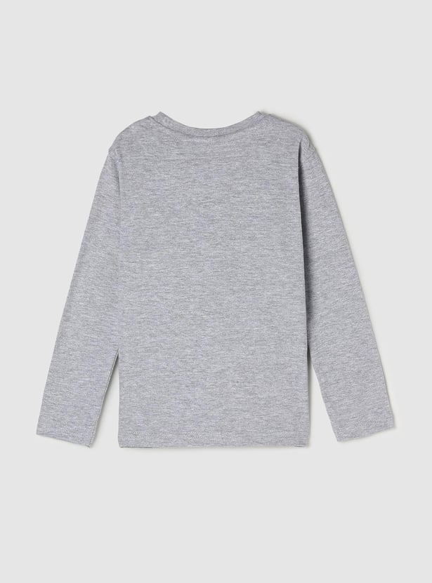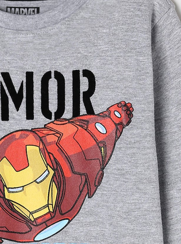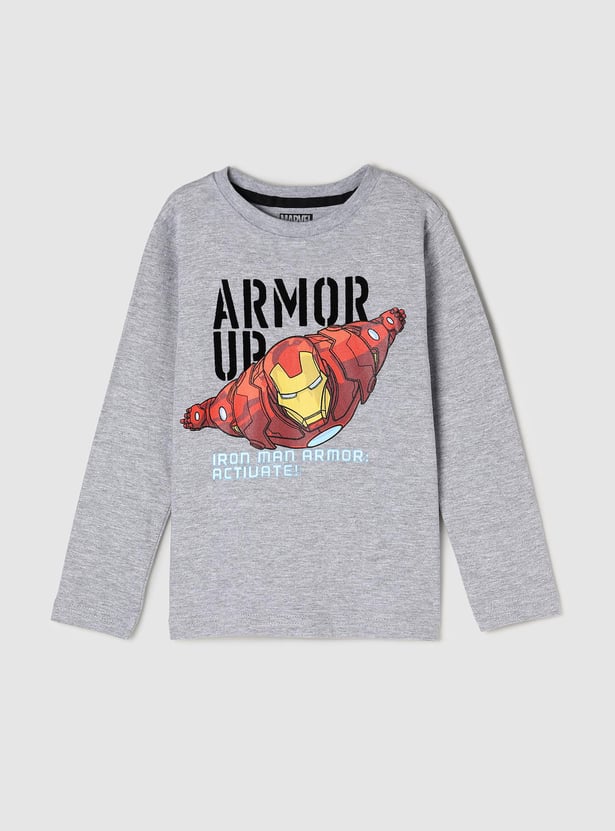 Updated with Iron Man-themed prints, this t-shirt with a heathered finish comes with a crew neckline and long sleeves.