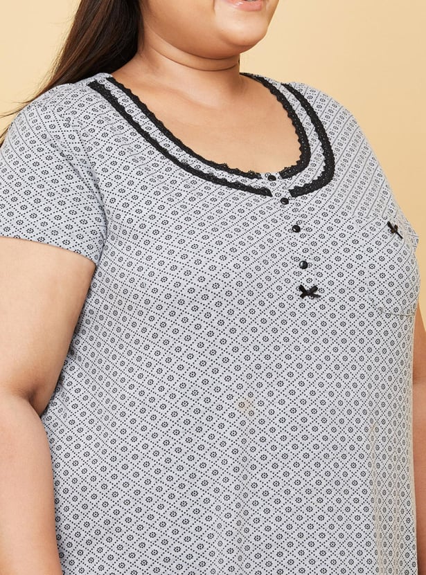 Amp up the comfy style with this printed nightgown designed with a half-button placket, lace detailing, and short sleeves.