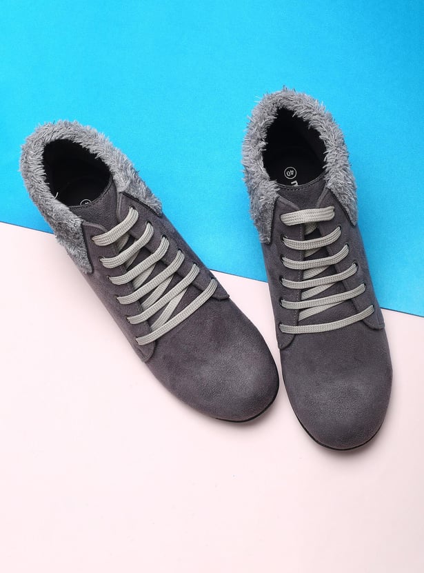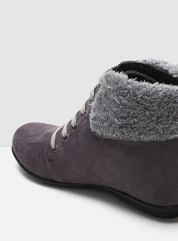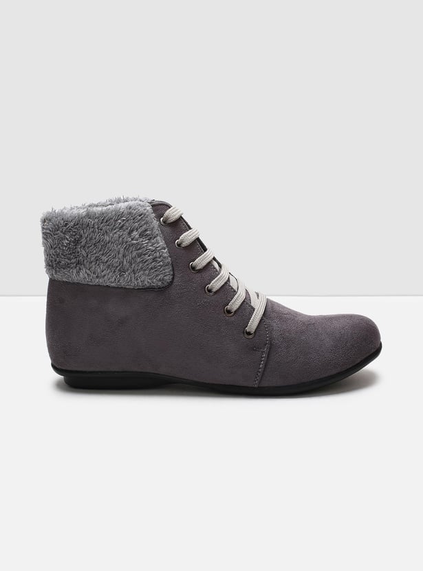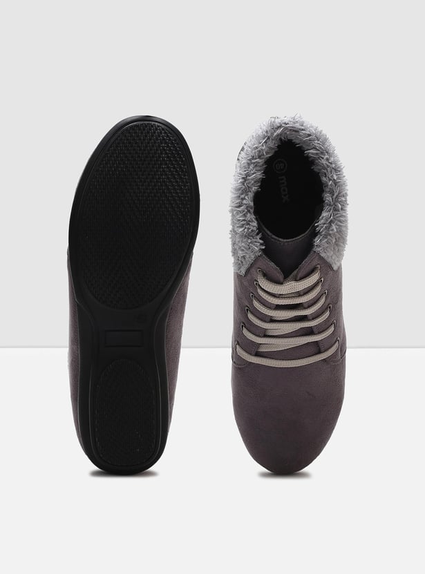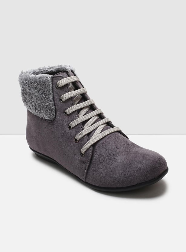 Crafted to impress, this pair of solid boots is an absolute love for your footwear fashion. It is amped up with lace-up closure, flat sole, and amazing comfortable wear.