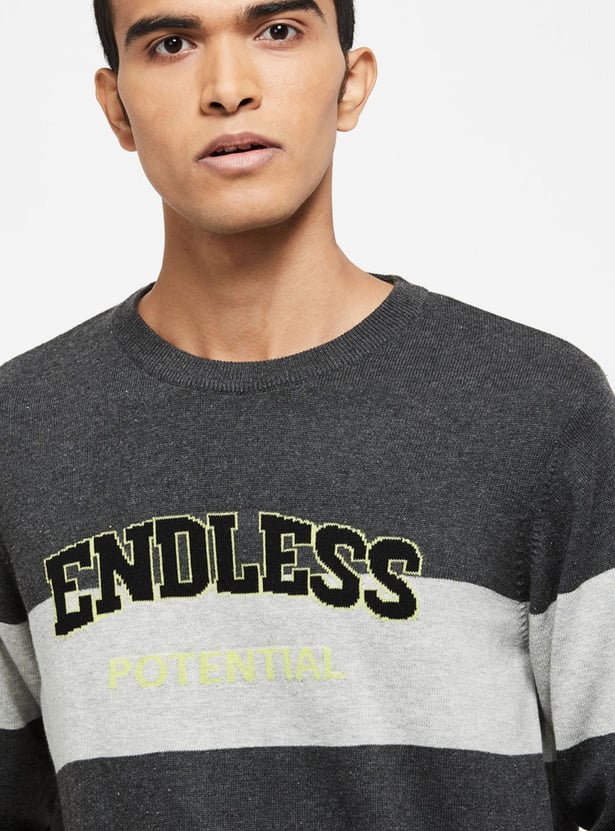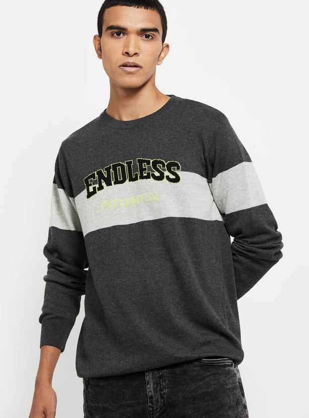 Get winter-ready with this pullover that comes with a typographic print on the surface, crew neck and full sleeves. It also contains a ribbed hem and cuffs.