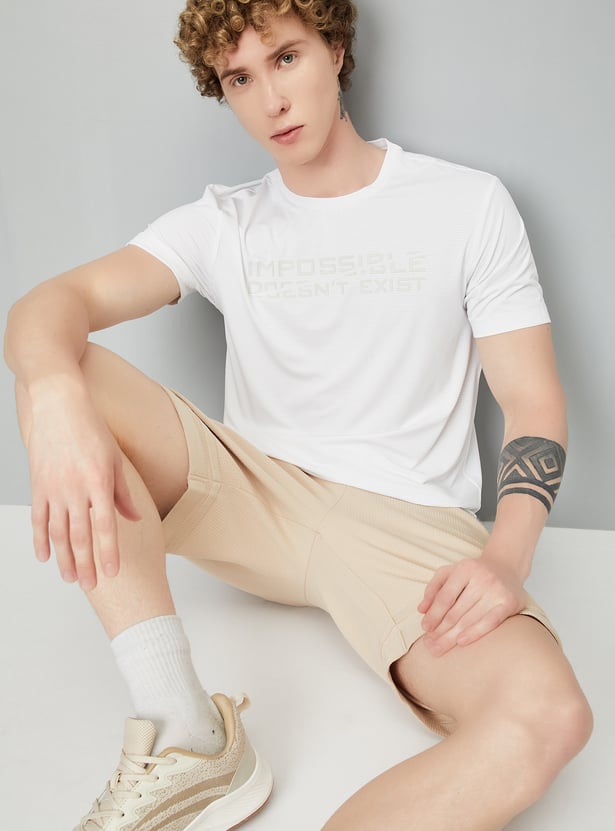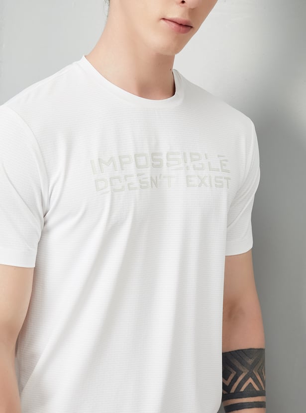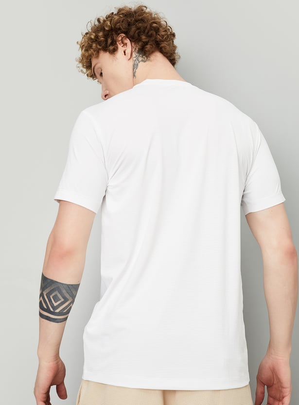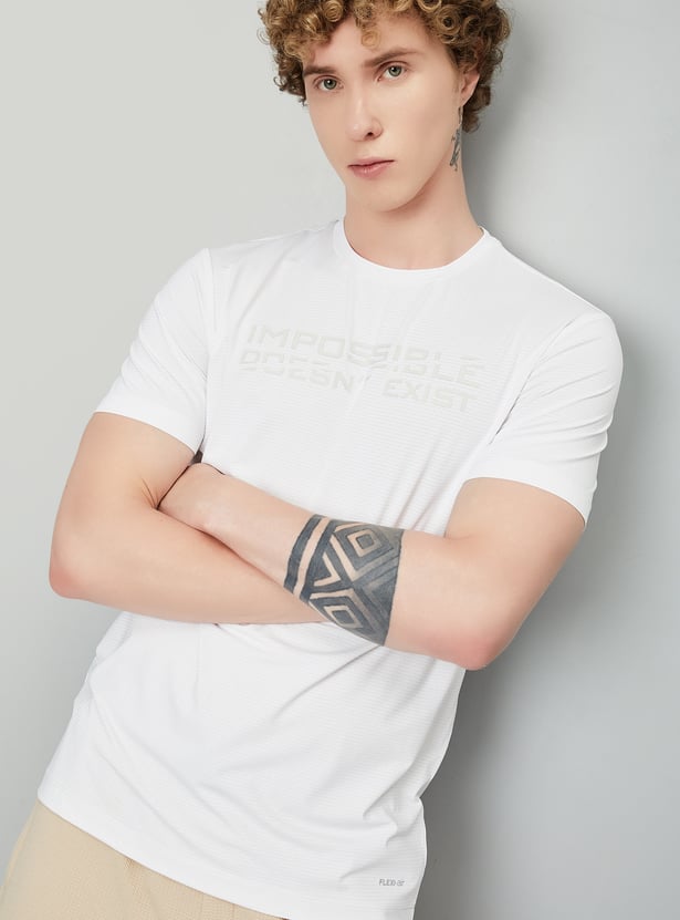 Stay bold and comfortable in this printed slim fit sports T-shirt, featuring a classic crew neck and half sleeves for a relaxed, athletic fit.
