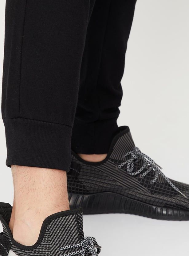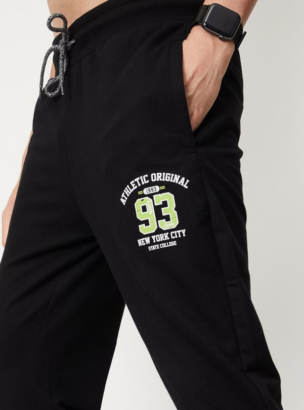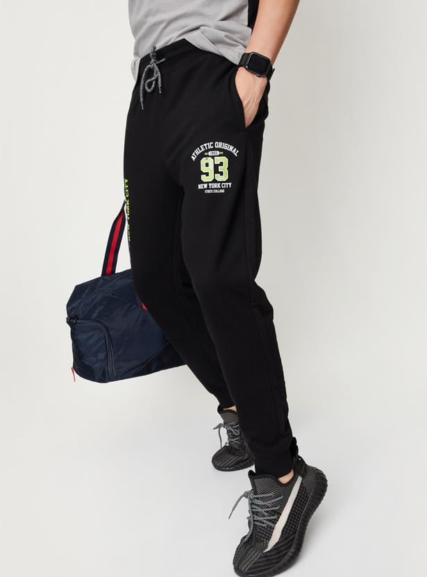 Hit the gym in style in this pair of joggers with a typographic print on the sides. It features a drawstring waist, side pockets, a back patch pocket, and ribbed cuffs. Style this pair of joggers with a tee and sneakers for a sporty, comfortable look.