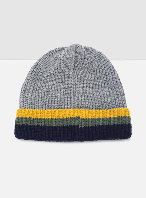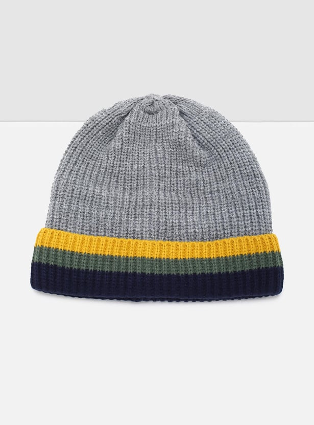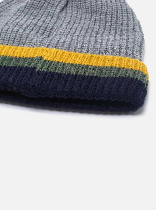Stay warm this winter in this beanie cap featuring a textured knit design and a striped cuff.