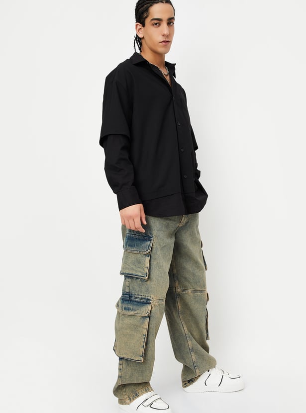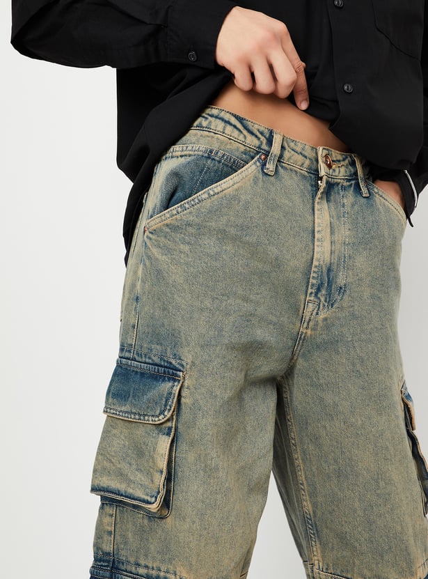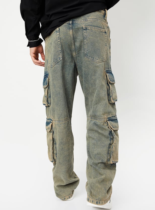 Upgrade your casual style with these washed utility cargo jeans, designed with a button closure and belt loops for a perfect fit. The cargo pockets add a practical touch, combining style and functionality.