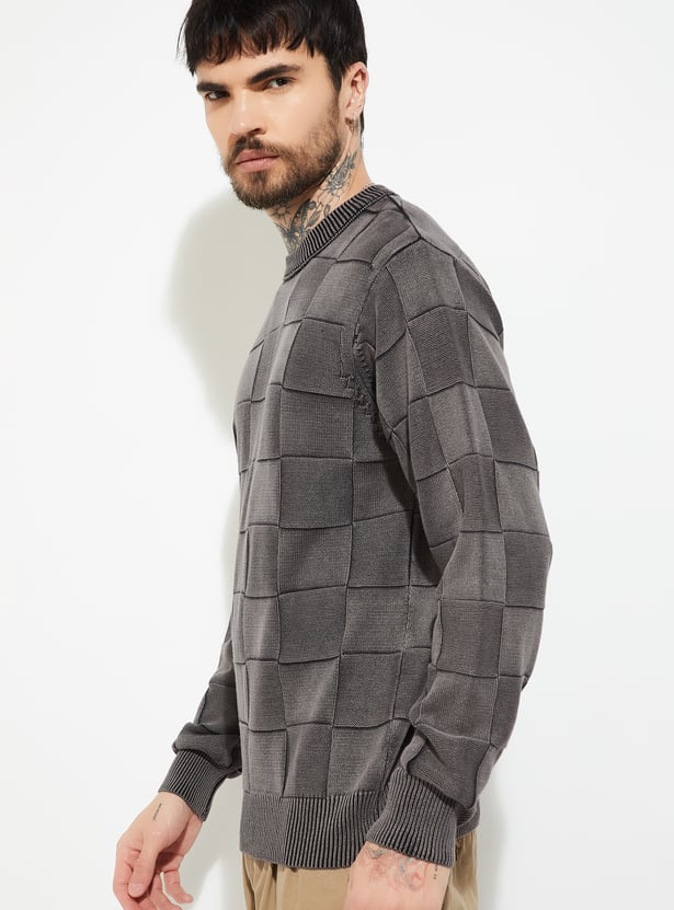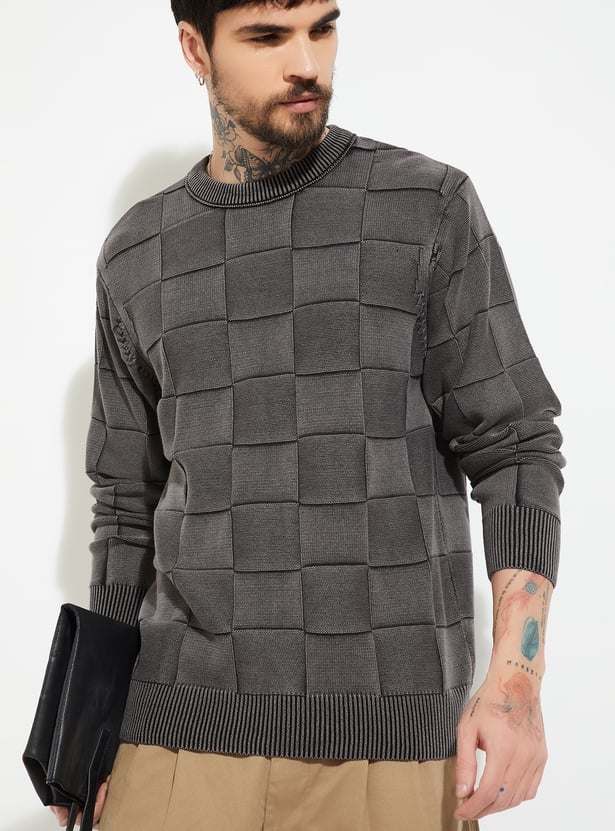 This checked, knit sweater combines clean lines with premium cotton comfort. Featuring long sleeves, a straight hem, a crew neck, and an oversized silhouette, it offers breathable warmth, easy layering, and timeless versatility for casual and semi-casual looks alike.