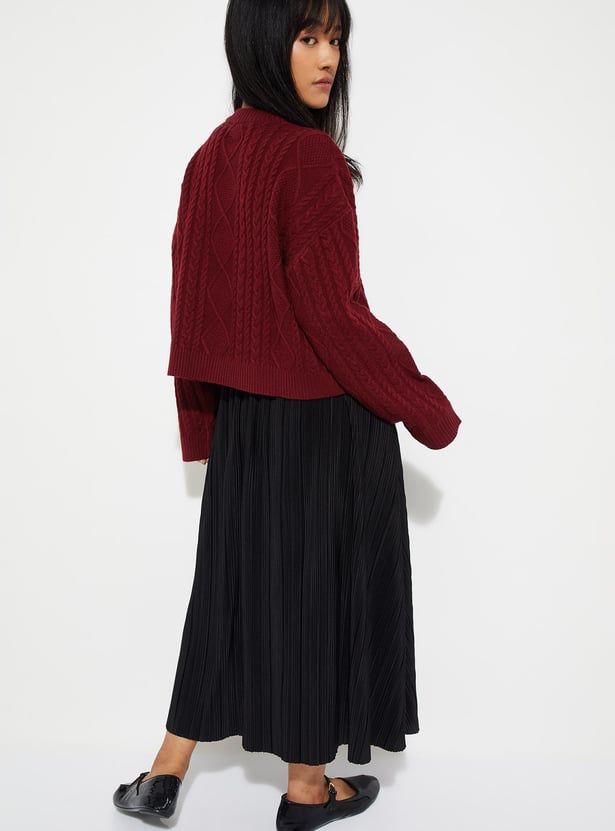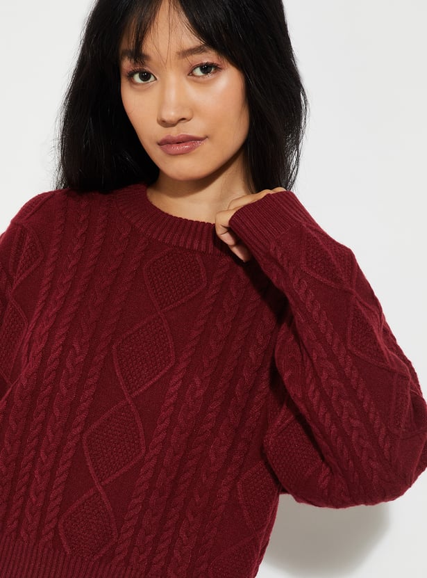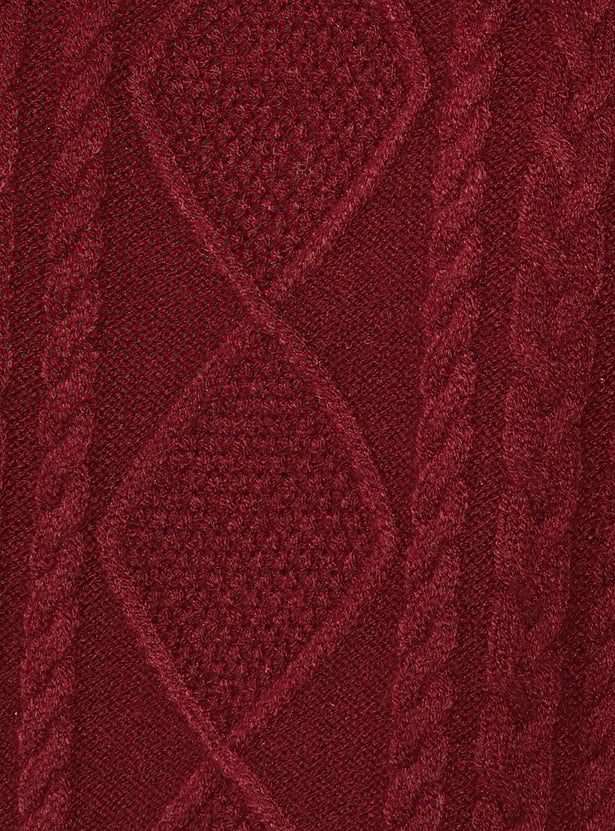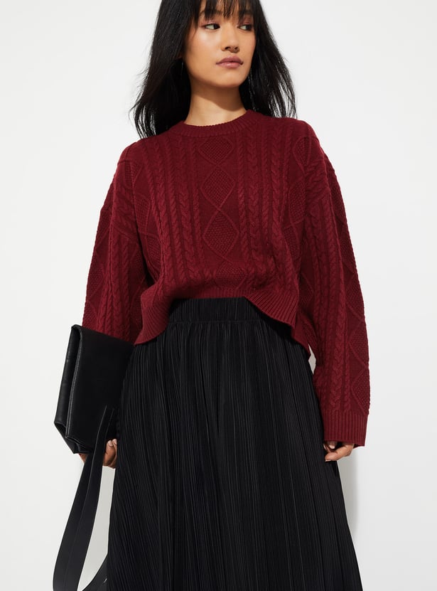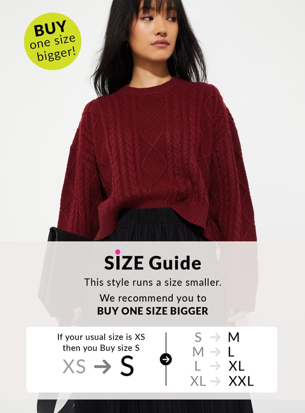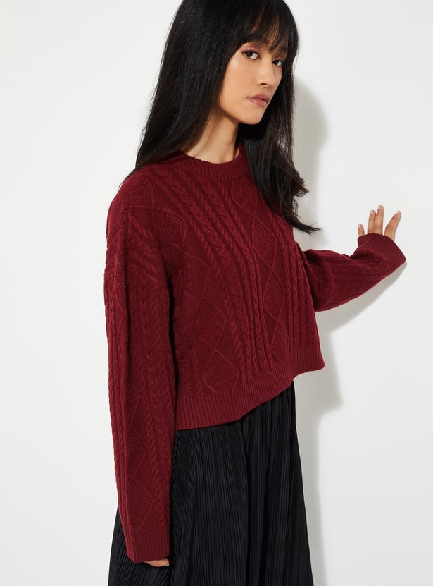 Stay cosy and chic in this cable knit sweater featuring full sleeves and a classic round neck. The ribbed hem adds structure, making it perfect for layering or solo wear.