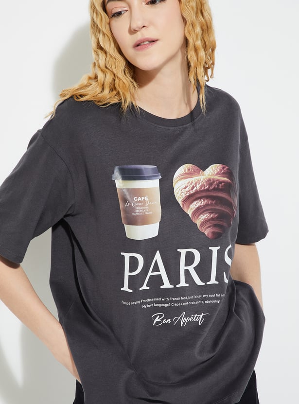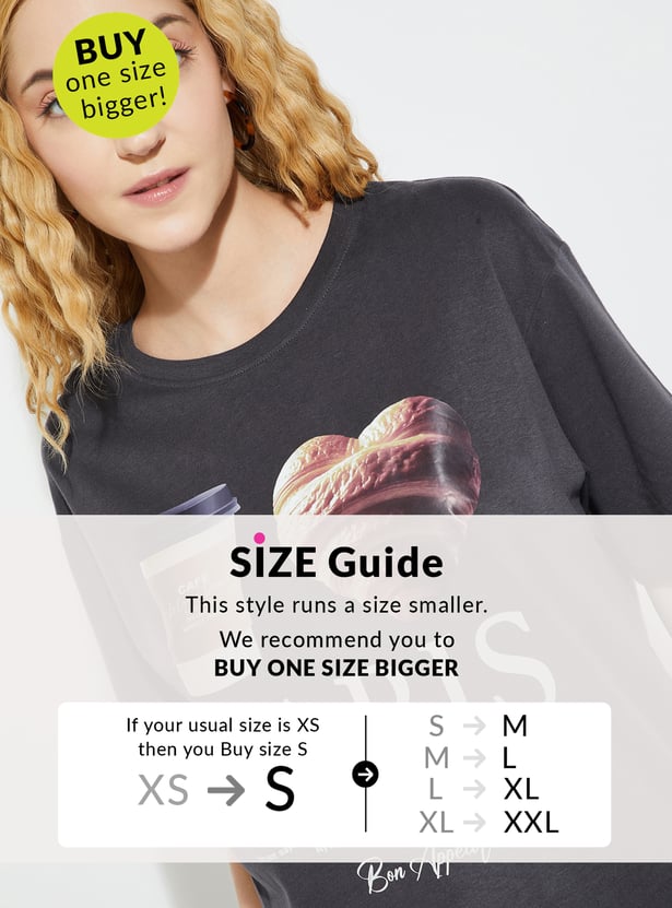 Make a bold statement with this printed oversized t-shirt, featuring a comfy round neck and relaxed half sleeves for an effortlessly cool vibe.